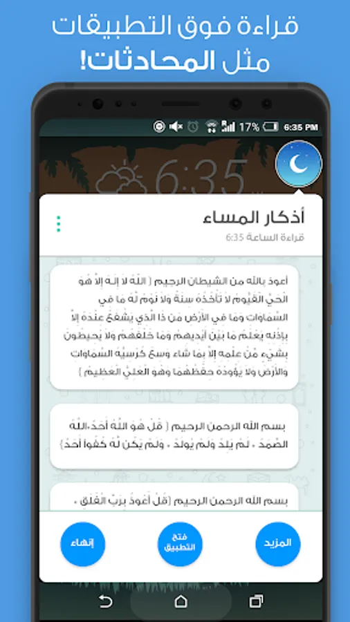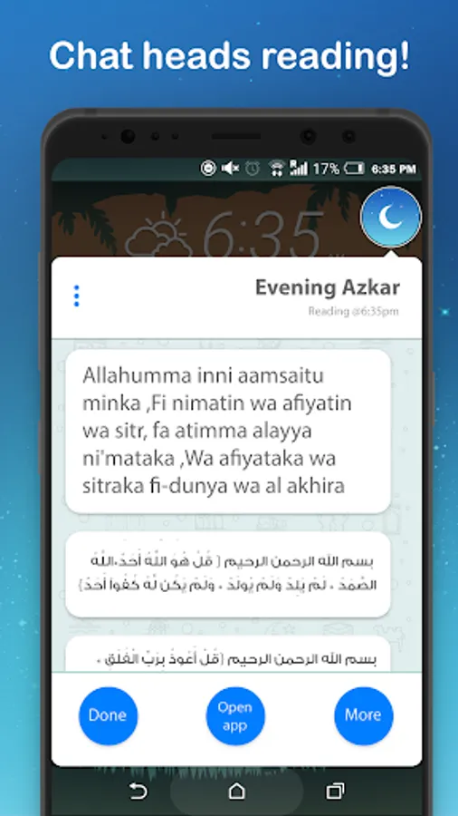- Read athkar's in Chat heads mode. (morning and evening adhkar)