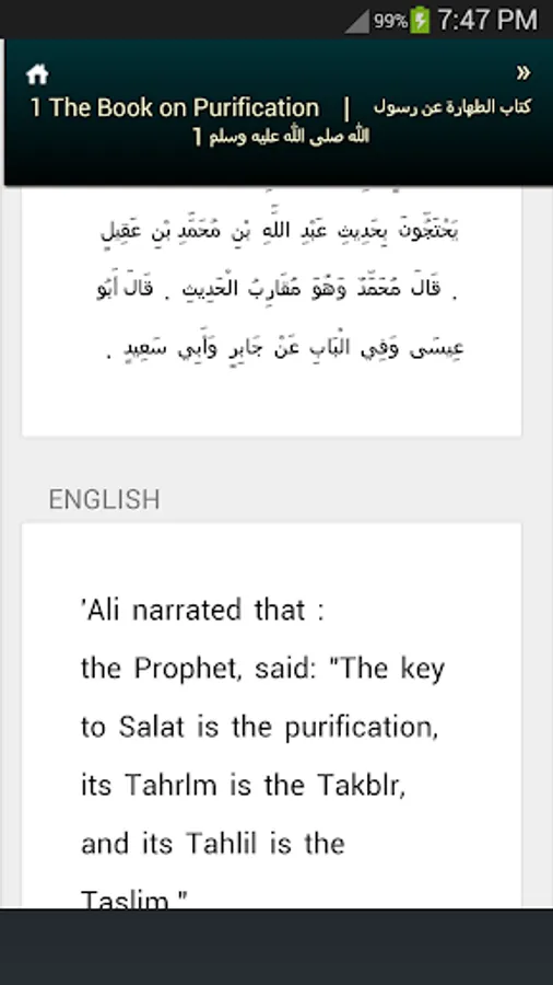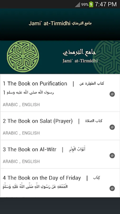 Jāmi` at-Tirmidhī is a collection of hadīth compiled by Imām Abu `Isa Muhammad at-Tirmidhī (rahimahullāh). His collection is unanimously considered to be one of the six canonical collections of hadith (Kutub as-Sittah) of the Sunnah of the Prophet (). It contains roughly 4400 hadīth (with repetitions) in 46 books.
