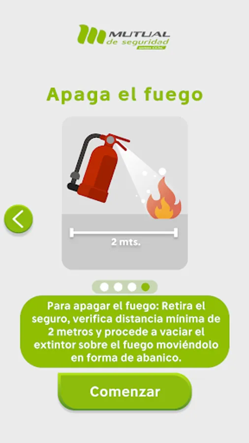 3. Put out the fire: Remove the insurance, verify the minimum distance of 2 meters and proceed to empty the extinguisher on the fire by moving it in the shape of a fan.