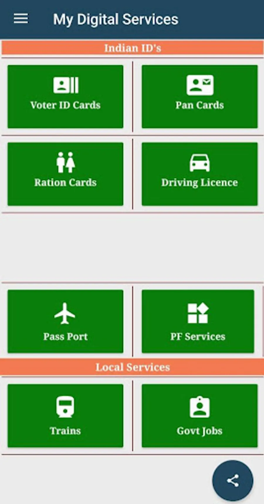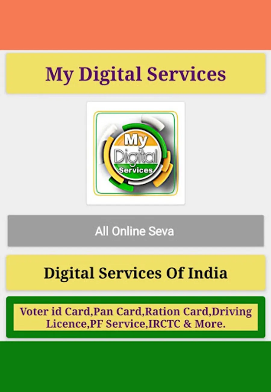 My Digital Services:Digital Online Seva:This app provides types of Online Services Like Voter Id Cards,Ration Cards,Driving Licence,PF Services,IRCTC Services Status,RTO Vehicle info all Services & More.