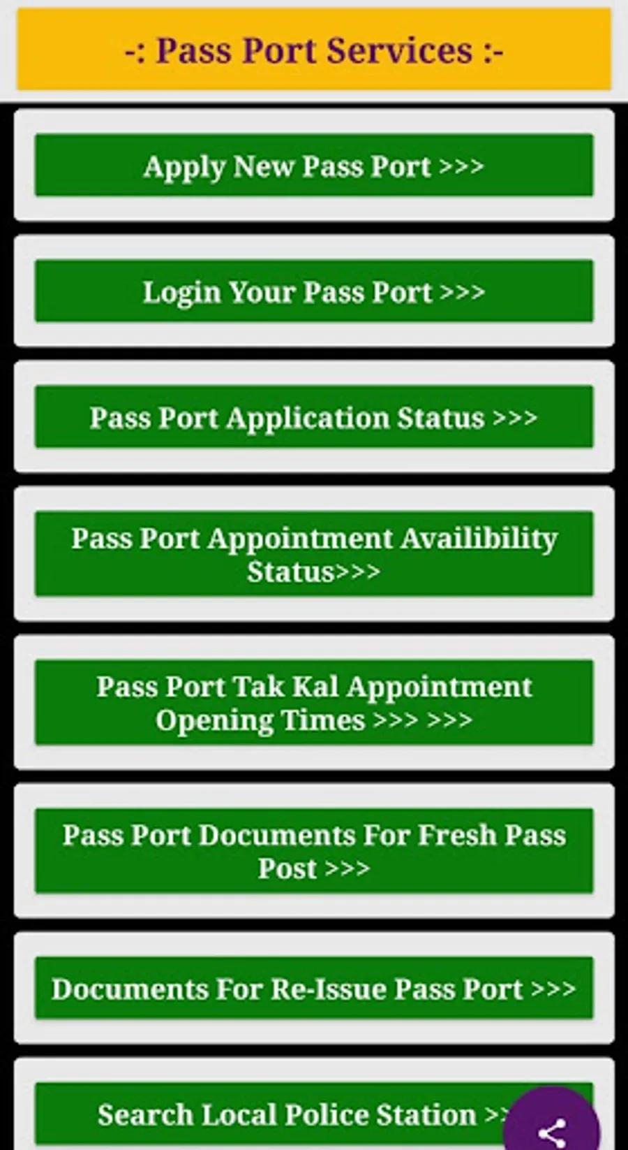 5. Pass Port Services:Indian passport is issued by order of the President of India to the citizens of India for the purpose of international travel.In the app provides following below services from Govt Website to search their Pass Port Details easily,source of website is:https://portal2.passportindia.gov.in/AppOnlineProject/welcomeLink#