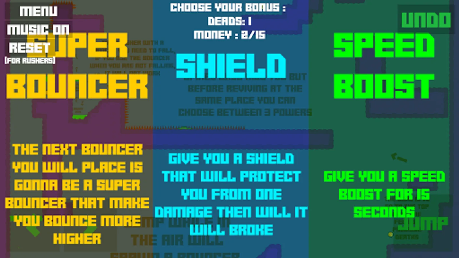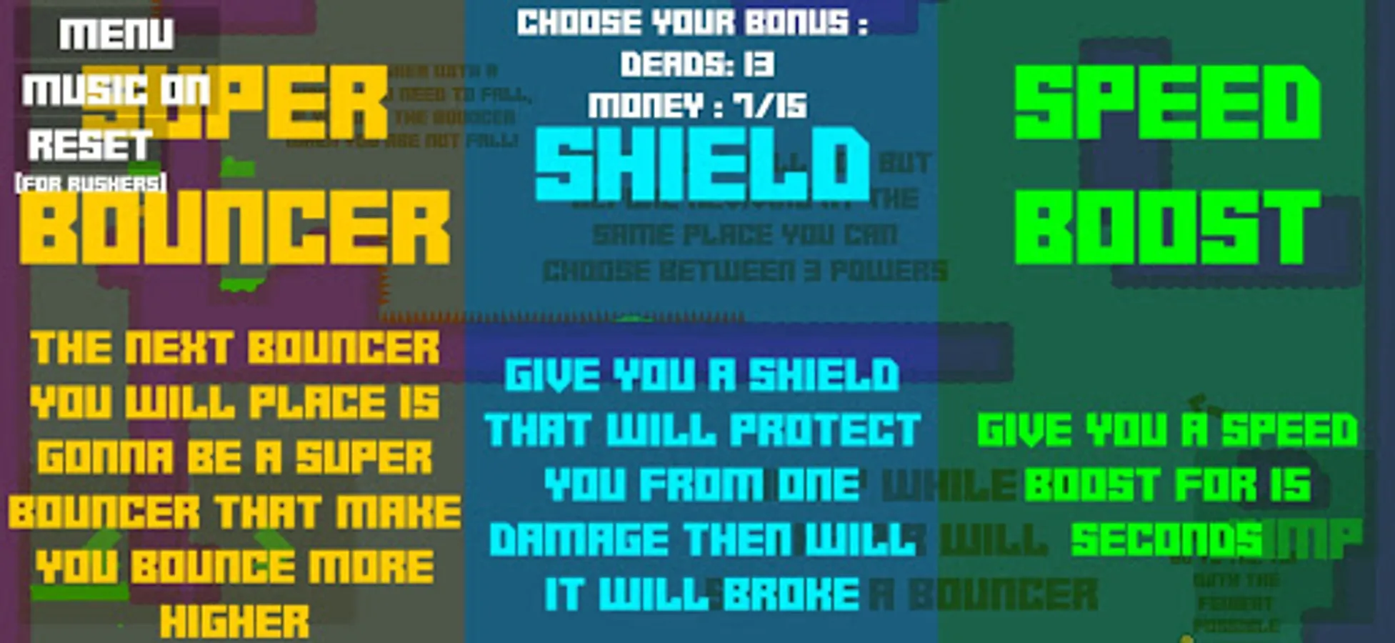 This game is a hardcore platformer where instead of heaving a dubble jump you can spawn bouncers. Bounce for fun !