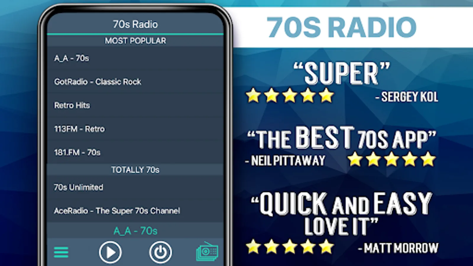 A: Unfortunately, 70s Radio Favorites doesn't support all devices and operating systems. This is the main reason we have decided to bring this app to you totally FREE! Try it out to see if we are coming in loud and clear, "Nothing ventured nothing gained." We are adding support for new devices all the time.