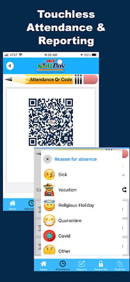 App has state approved attendance tracking to allow sign in/out of parents and staff. Parents can use 4 digit pin or touchless QR code to securely check in/out their children or staff can take attendance. Reports are automatically generated and can be submitted for reimbursements.