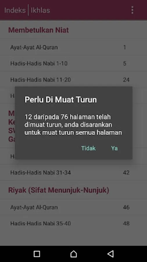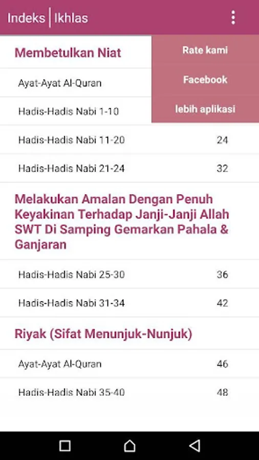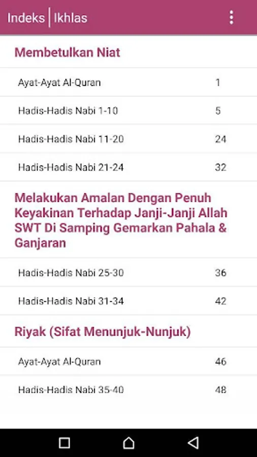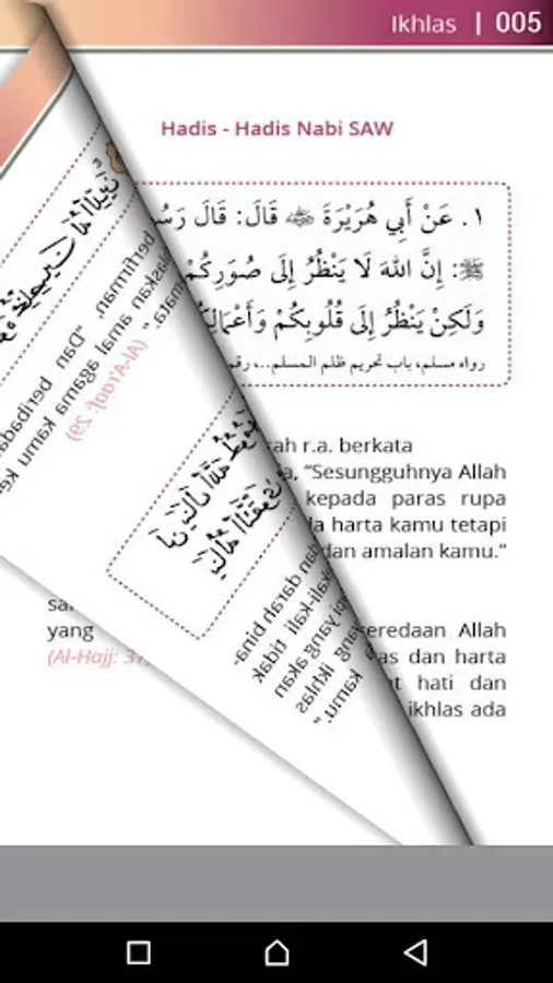 Alhamdulillah, the fifth chapter of Muntakhab Ahadis (Ikhlas) is completed specially for all Muslim readers. This application gathers verses of Al-Quran and hadith from our Prophet Muhammad SAW about the ways to fulfill the rights of fellows Muslim brothers that we can apply in our daily routines. Other than that, it also states the benefits and rewards that we can gain by applying all the sincere learning that had been taught.