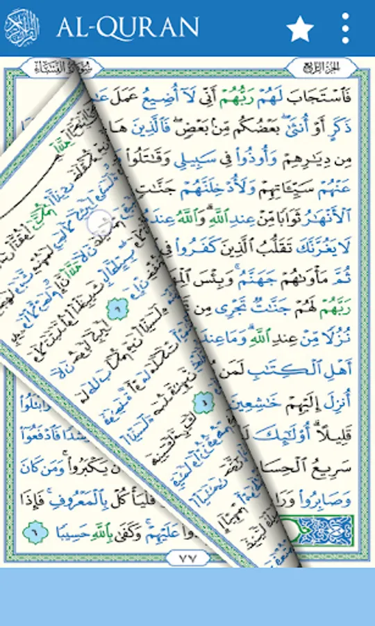 Al-Quran Word by Word Color Code is the App that help people in all over the world to easily use the al-quran in everywhere in their mobile handphone. Now you can read Al Quran anywhere anytime with this application with ease. 2 Colors Designing of Al Quran separate the words, so user can read and recite the Holy Quran very easily. This app also have any interesting and useful features that every user desire to have, such as, bookmark pages, maintain bookmark list, with Page curl effect experience like the real book reading. Suitable to use for all ages and prepared in accordance with the real Al-Quran using simple text.