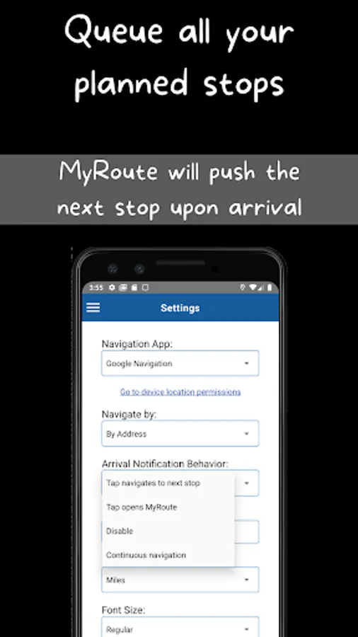 Simply insert addresses or load your planned route and navigate using your selected navigation app. Upon arrival, MyRoute will send you a notification for your next stop.