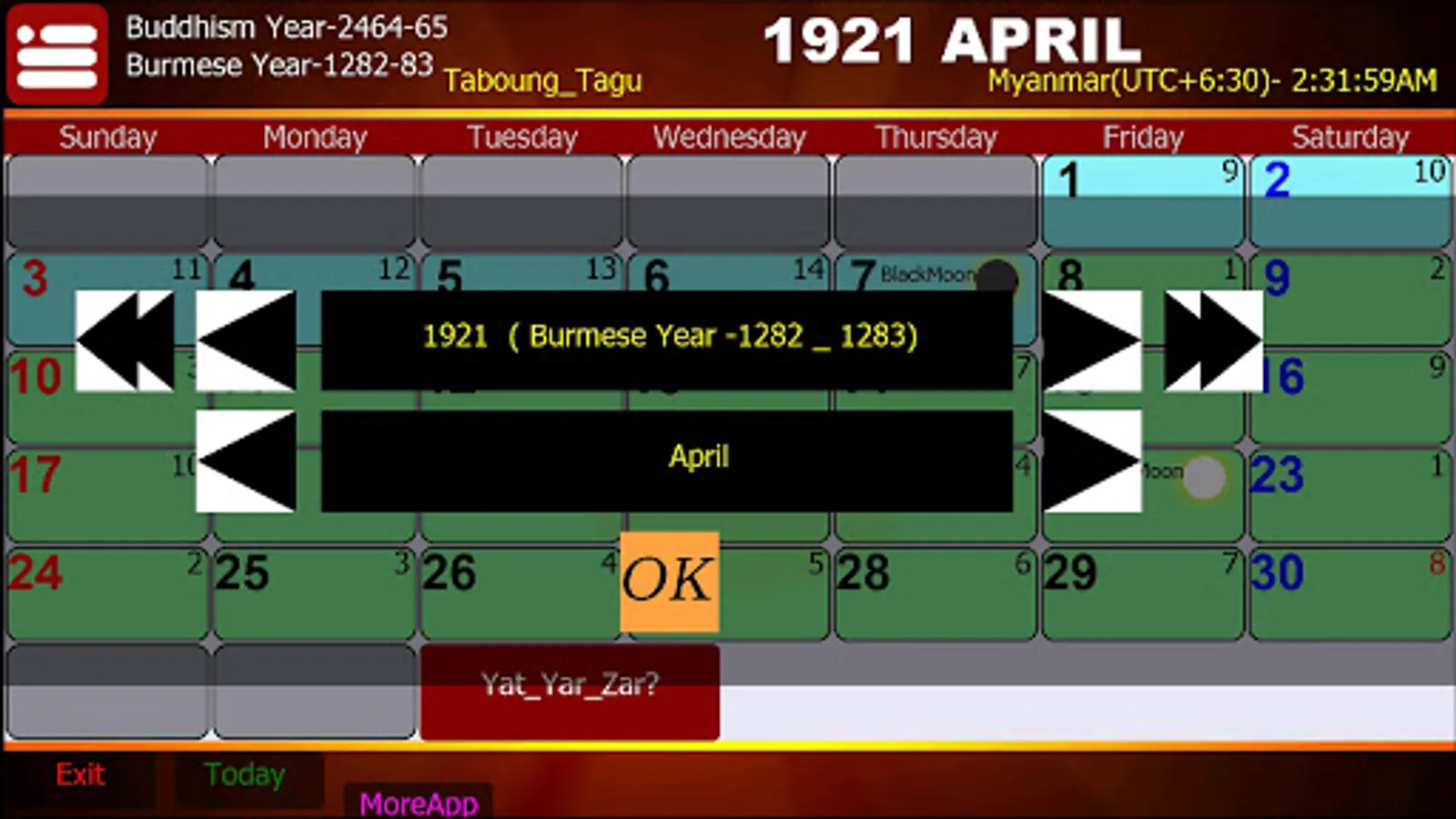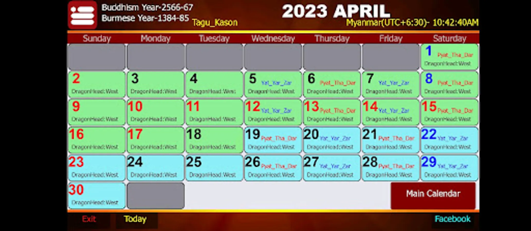 Find details of Myanmar Calendar (Pyat-tha-dar/ Yat-yar-zar/ Opote ).