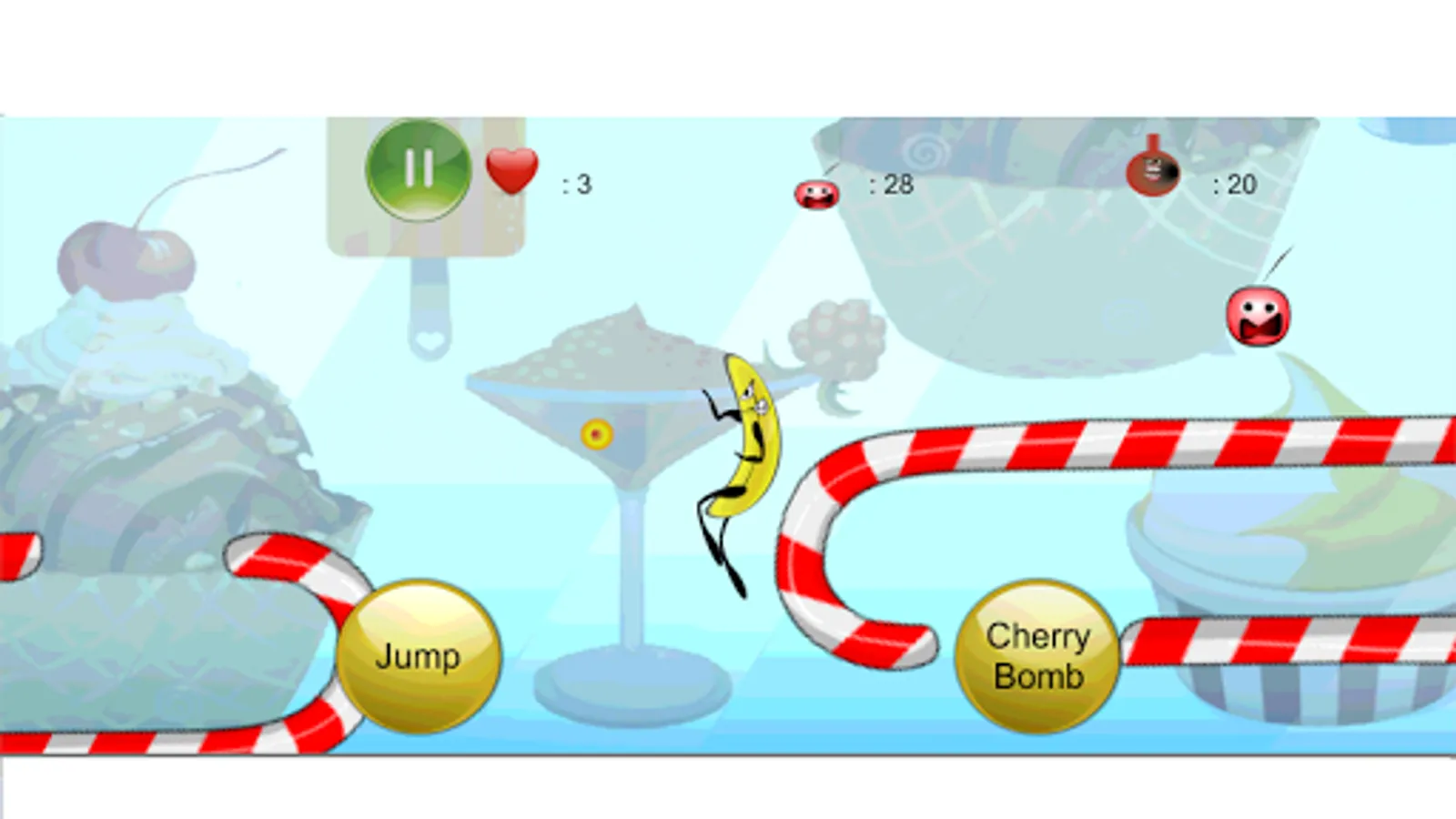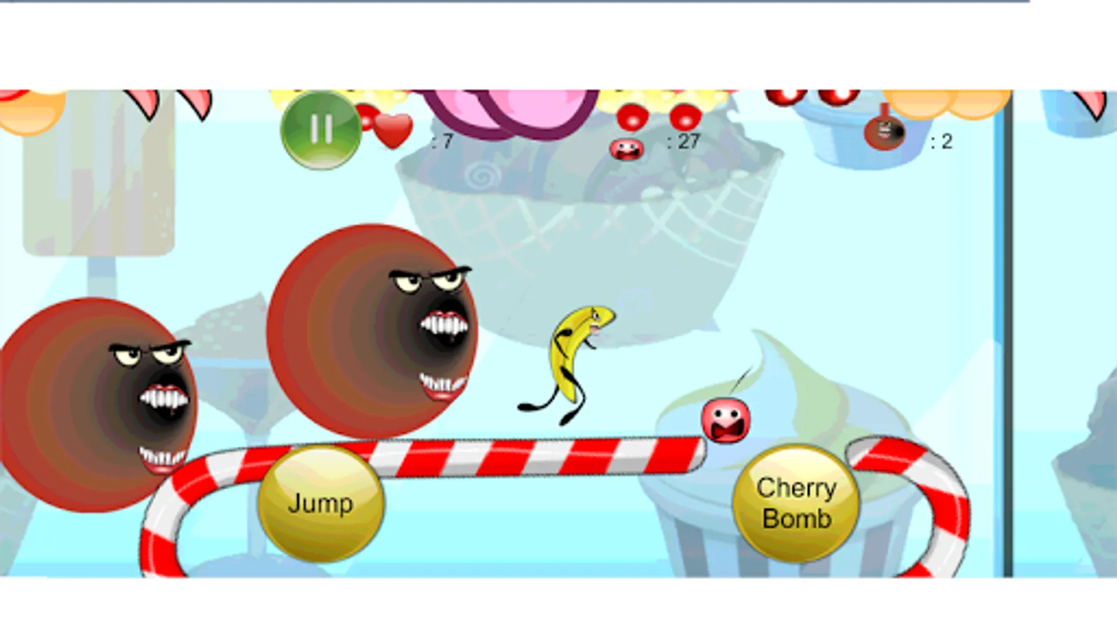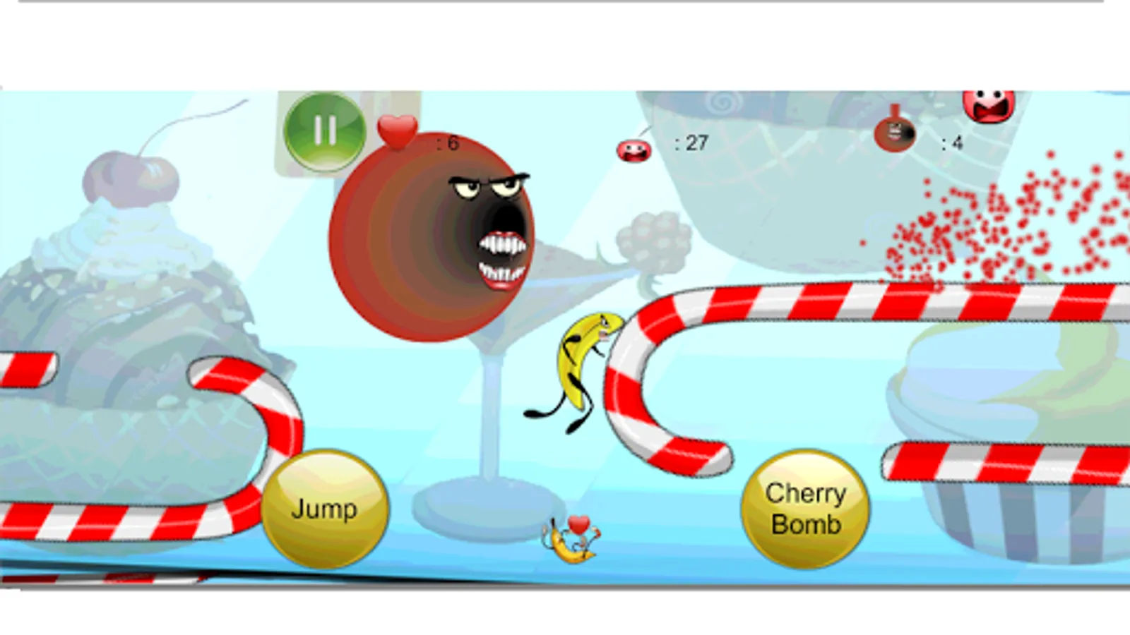 This is an adventure game about a banana racing through levels to save his falling cherry friends before they collide with the candy cane ground and alert the evil cherry who will attempt to stop him from completing his mission.