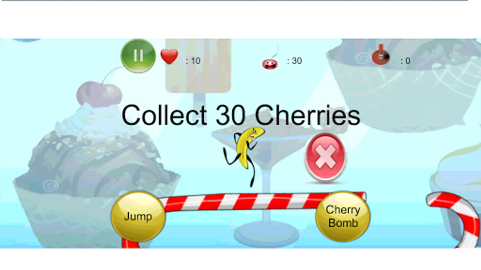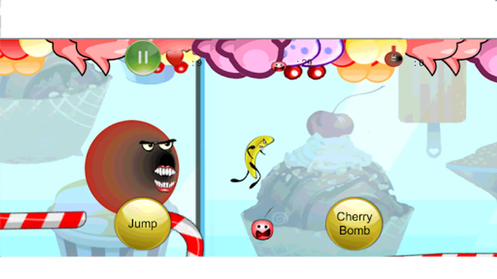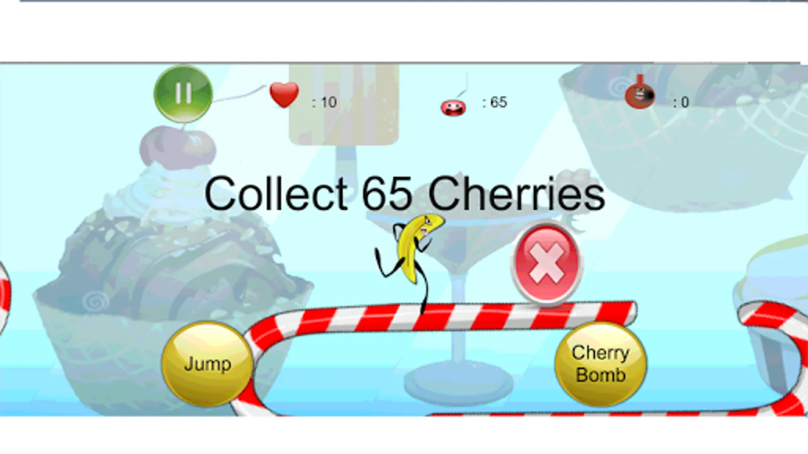 This is an adventure game about a banana racing through levels to save his falling cherry friends before they collide with the candy cane ground and alert the evil cherry who will attempt to stop him from completing his mission.