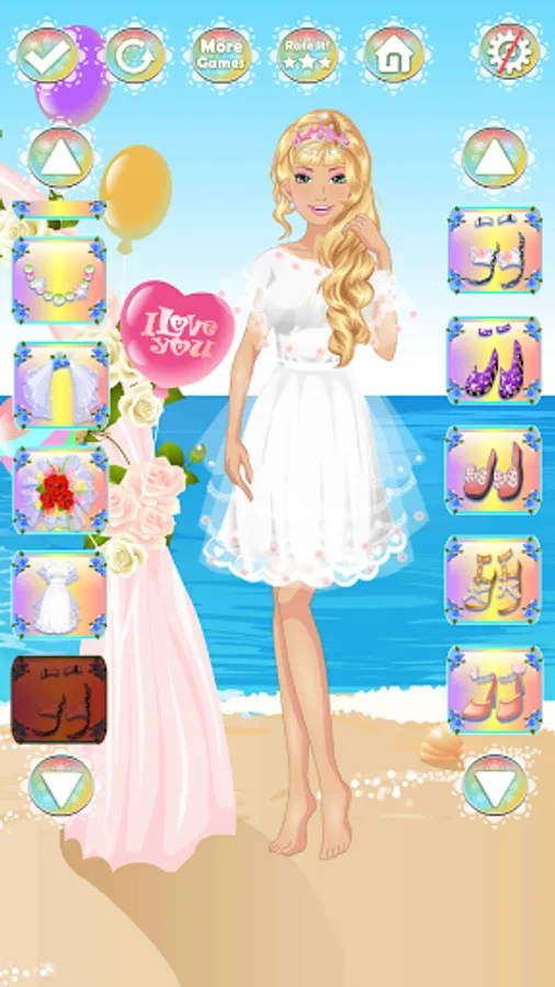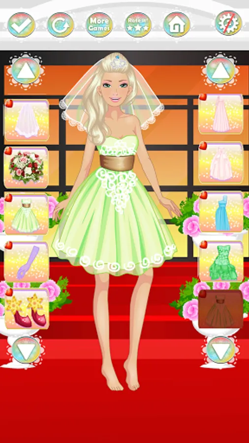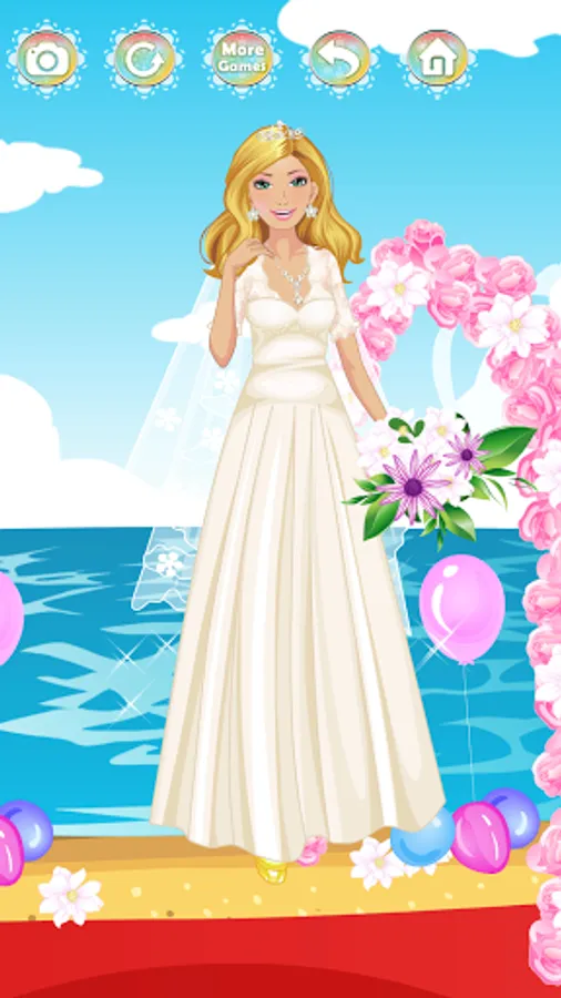 This wedding dress up game has 3 main sections and you can dress up our model with different wedding dresses on each section.