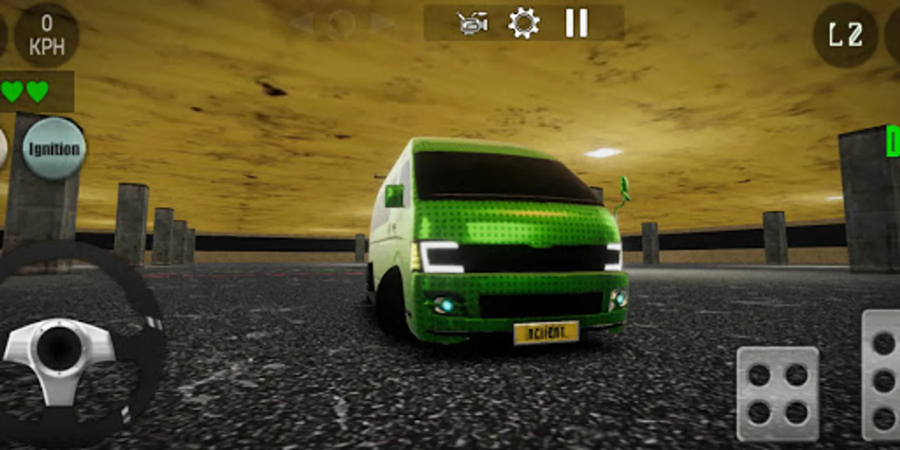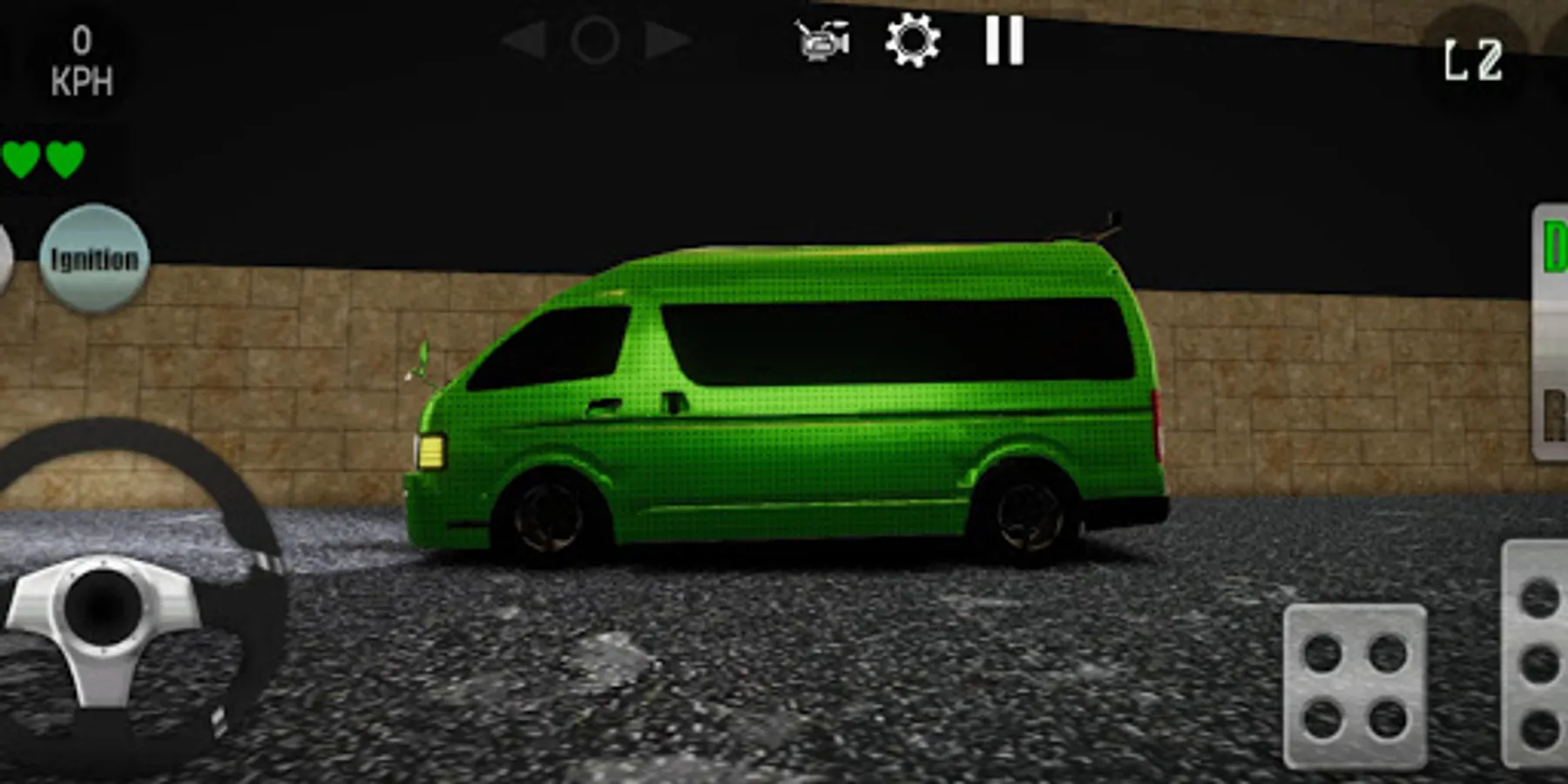 Control your van in a real parking lot with an on-screen steering wheel, acceleration and brake pedals.