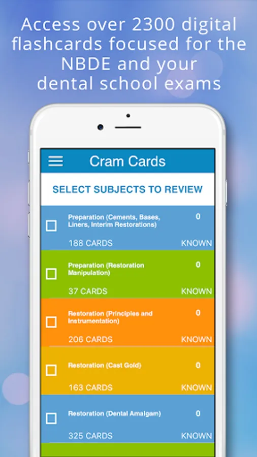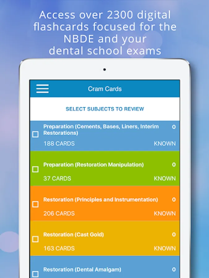 In order to achieve the best customer satisfaction, we always take your feedback into consideration. This is why most of the improvements, fixes and additional features came from your suggestions and requests. Please email us at info@cram-cards.com as we are always here to support you. We look forward to helping you in prepping for your dental school exams and in acing your NBDE.