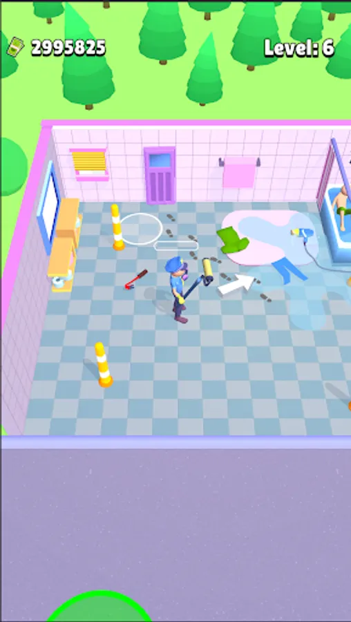 Your task is to clean up the crime scene. Collect evidence, photograph the crime, clean the floors and walls from the traces of the criminal. Get paid for completed tasks. Each level is a new crime scene, upgrade your equipment to complete all levels more efficiently