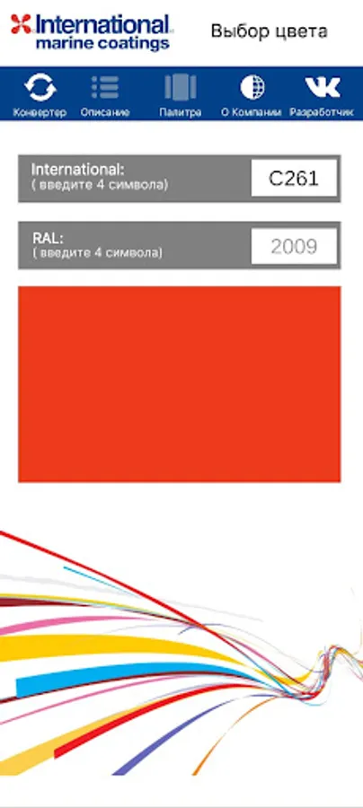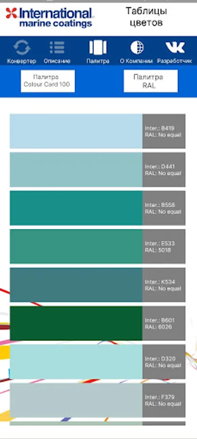 This application will allow you to find the color equivalents of International and RAL paints, as well as find the datasheet for International products. Full RAL and Color Card 100 palettes are also available, with color codes and visual color representations.