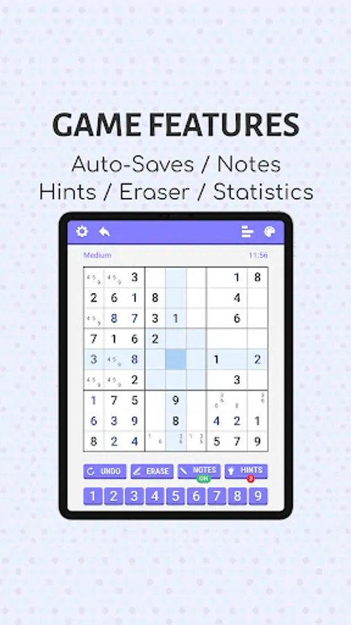 ✅ Auto-save ➡️ The game will be saved if you leave it before you finish it. Then you can continue the sudoku puzzle game at any moment.