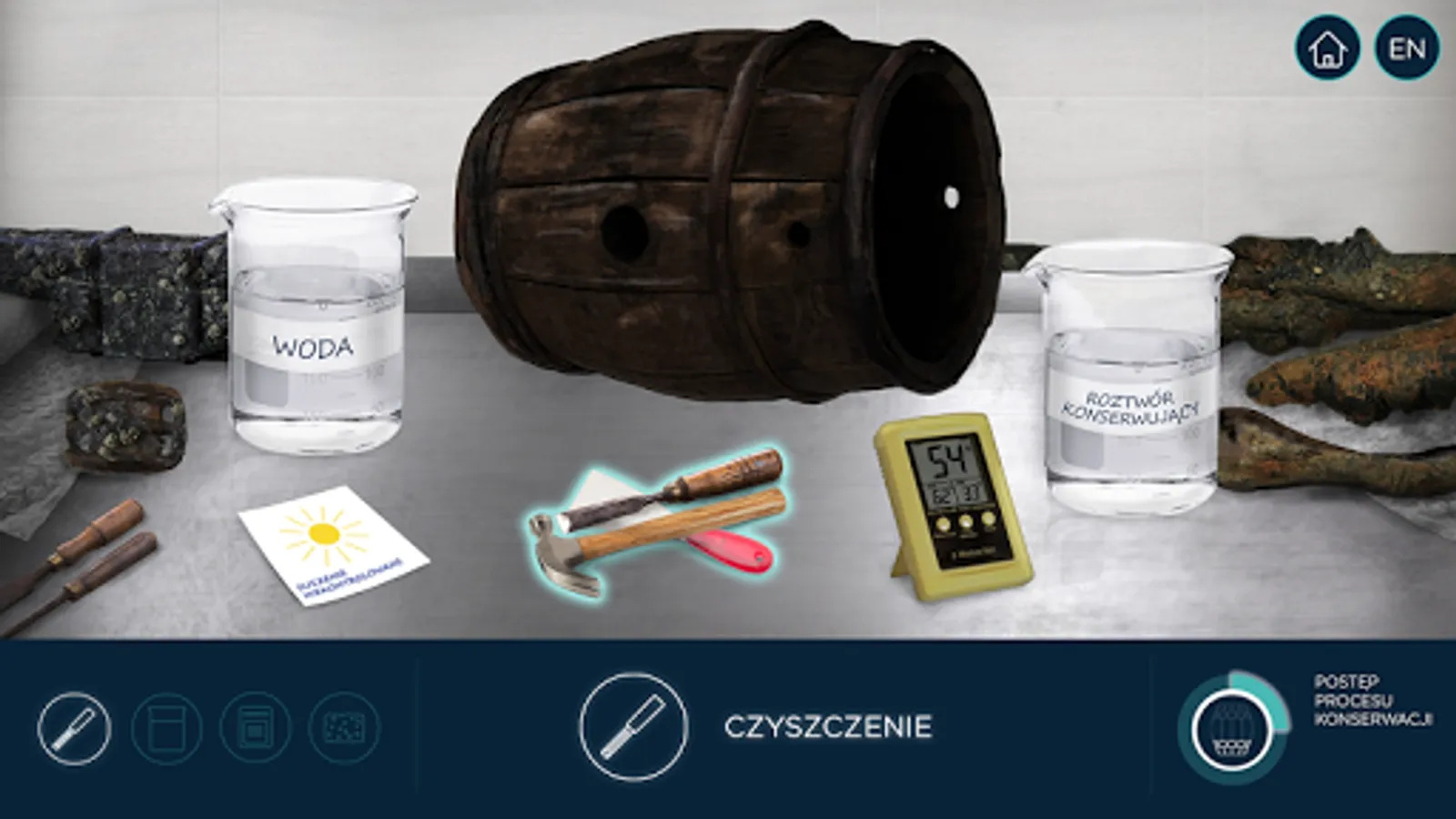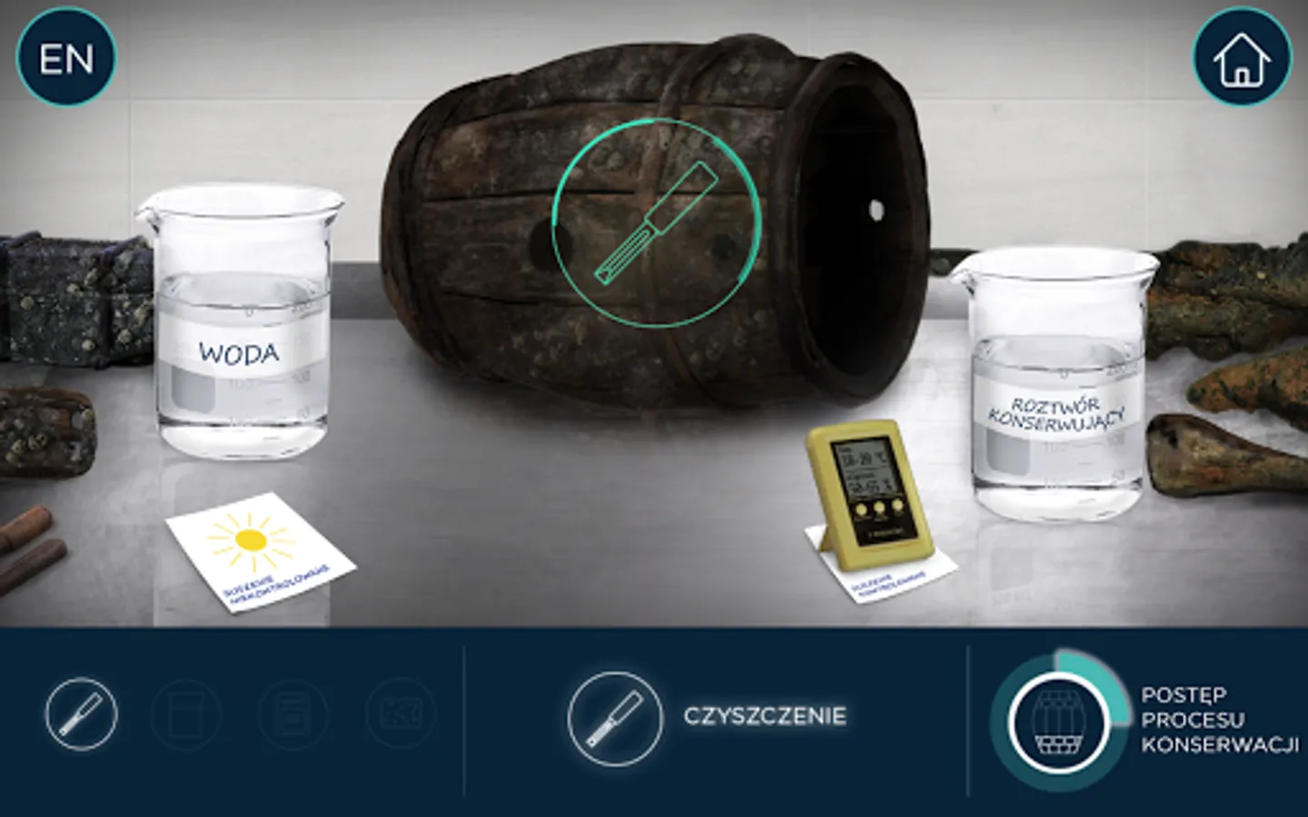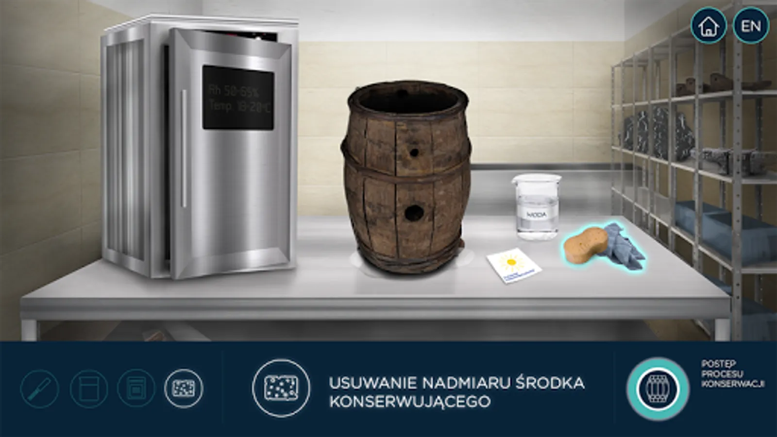 Yield maintenance wooden barrel excavated from the wreck of a medieval ship. Select the appropriate method to work and watch the reactions on the surface of the object preserved. The game is owned by the National Maritime Museum in Gdansk.