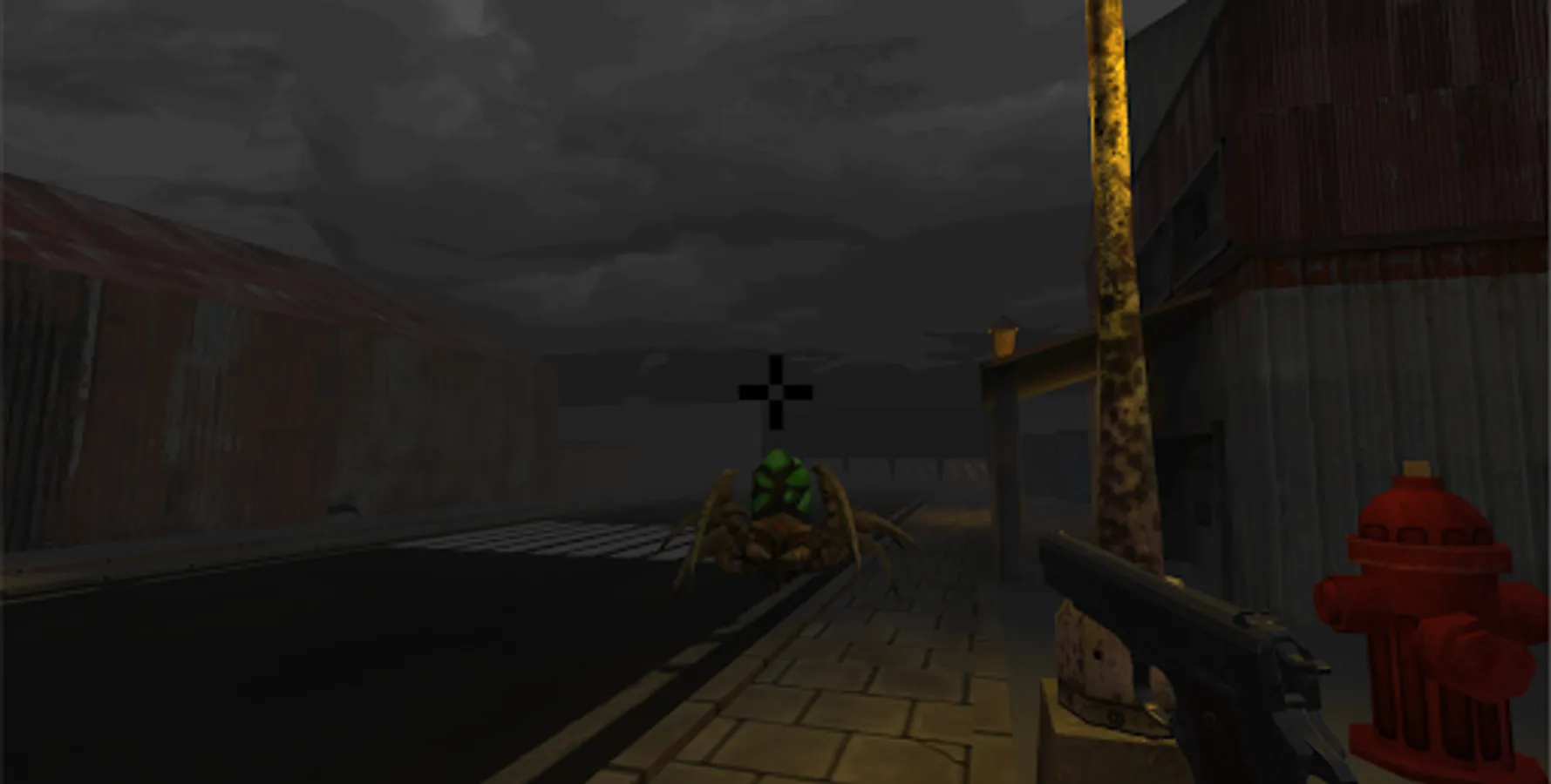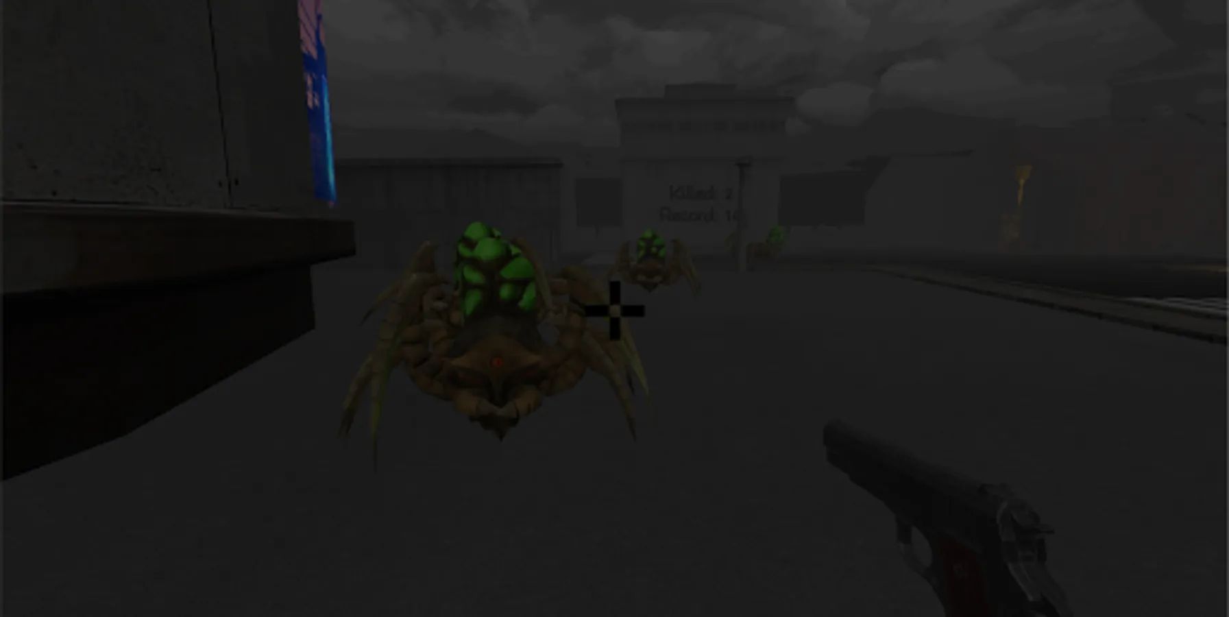 ...actually in some urbanistic crossroad alien spider has arrived. What are their aims - we don't know. Thay are just aggressive to player, so he hunts them. Or vice versa.