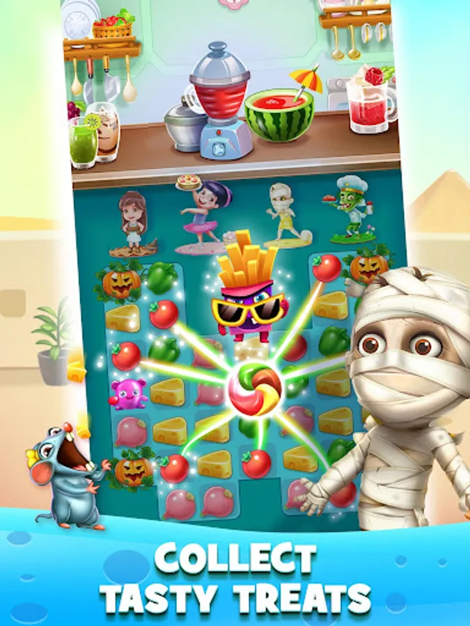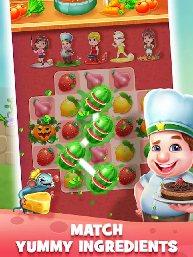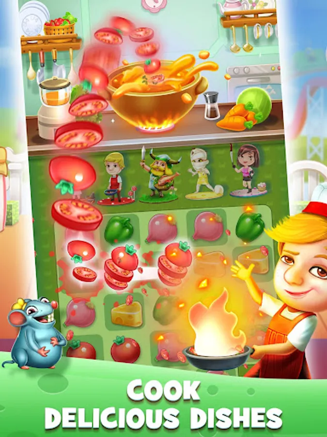 Help Bob, Leo and Grumpy Granny and many more chefs cook delicious dishes as they travel the world matching ingredients from sandy shores of Tropical Paradise to the evergreen beauty of Charming Countryside. Solve the puzzles to cook tasty treats, complete levels and earn Chef Badges. Use power ups and blast your way through obstacles and the mischievous rat!