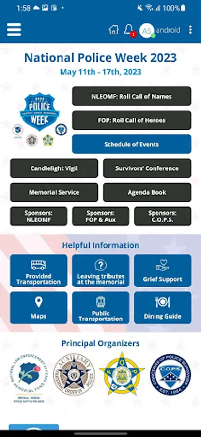 The National Police Week app is your go-to for crucial National Police Week information. Get notified as flagship events take place, find your way to landmark locations, virtually memorialize our beloved fallen heroes on the National Law Enforcement Officers Memorial, and find resources to help cope with the death of your officer.