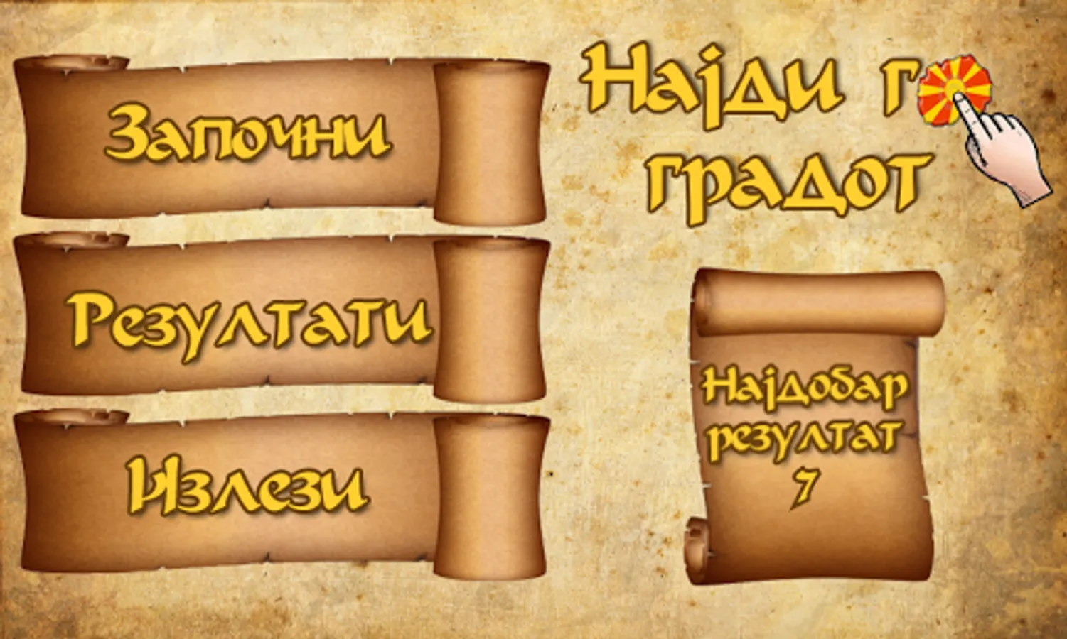 Географска едукативна игра каде што се исцртува картата на Македонија со нејзините области. Потребно е да се погоди во која област се наоѓа бараниот град , така што иглата од горниот десен ќош треба да се повлече врз една од понудените области. Секој погоден град носи 1 поен. Можност за глобално натпреварување со останати играчи преку ScoreLoop мрежата .