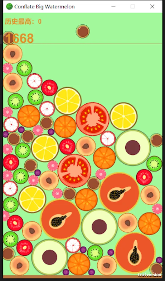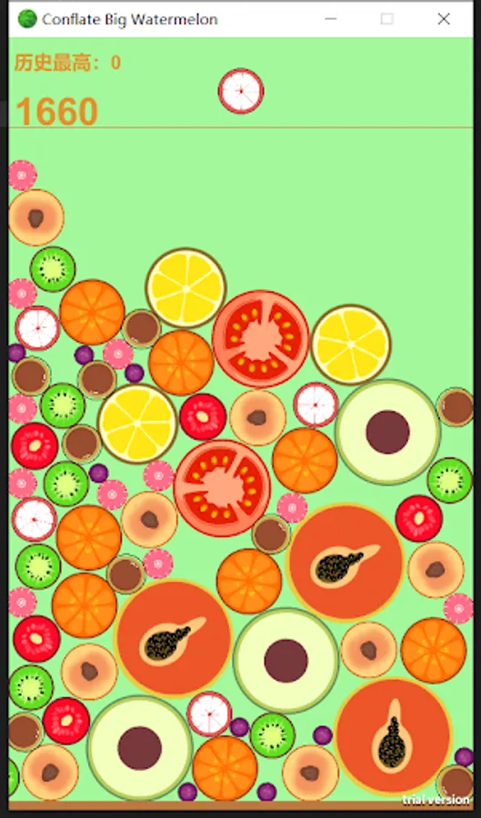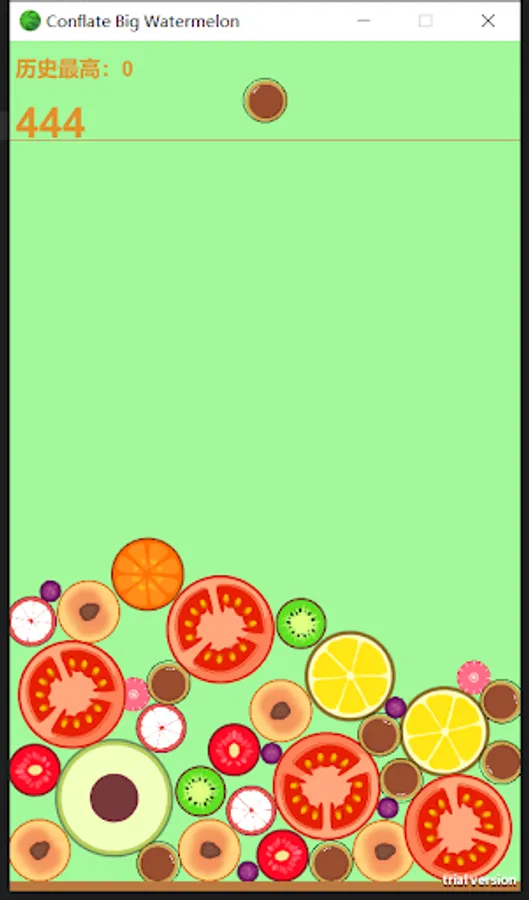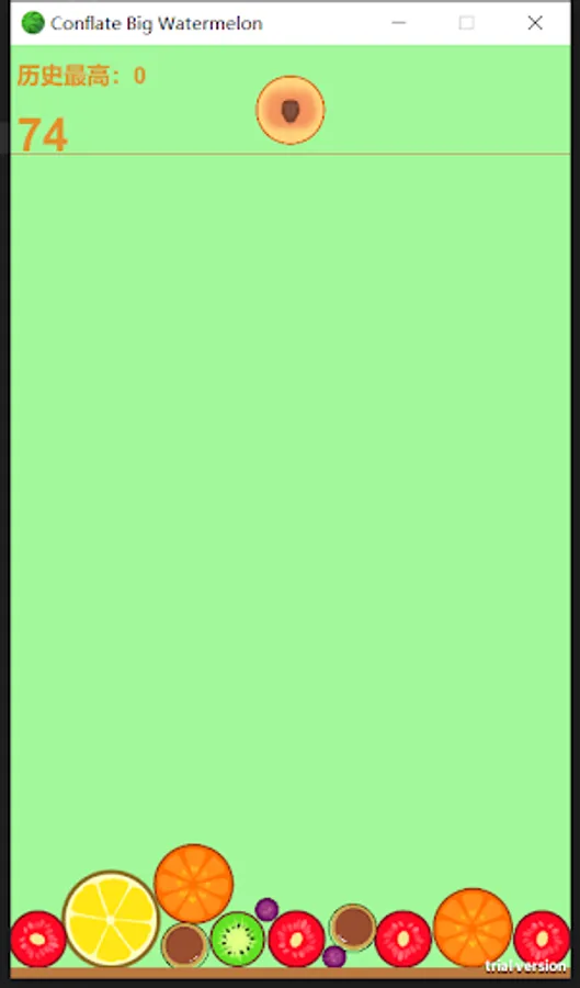Players need to throw oranges, grapes, oranges and other fruits randomly assigned by the system one by one. When two of the same fruits collide, they will synthesize larger fruits, so as to finally achieve the goal of synthesizing a large watermelon. To put it simply, this is a small game similar to Tetris + Happy Match + 2048.