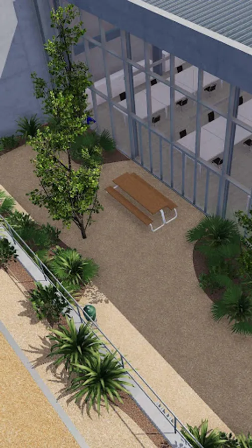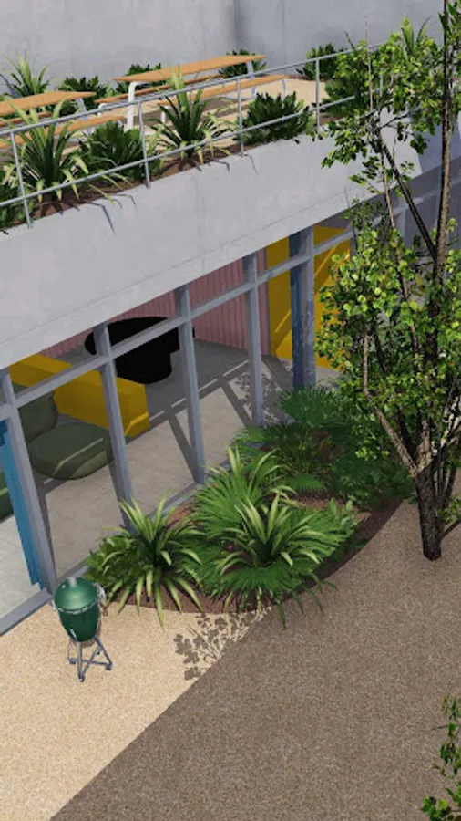 Large windows flank the right side of the garden where the working environment is situated. A sea of light and an explosion of color determine this large open space. Sitting at these desks, you experience a pleasant smell with your favorite music playing in the background.