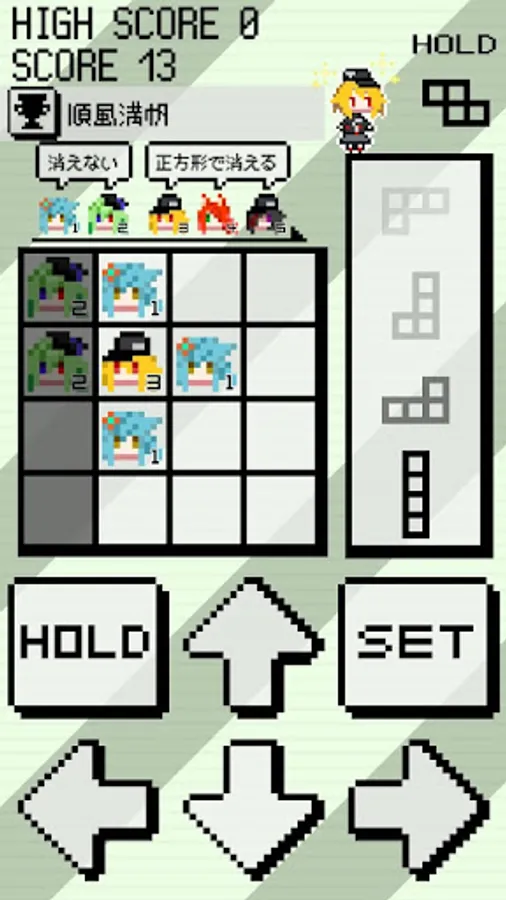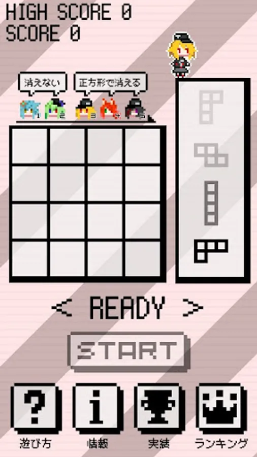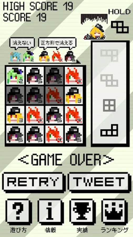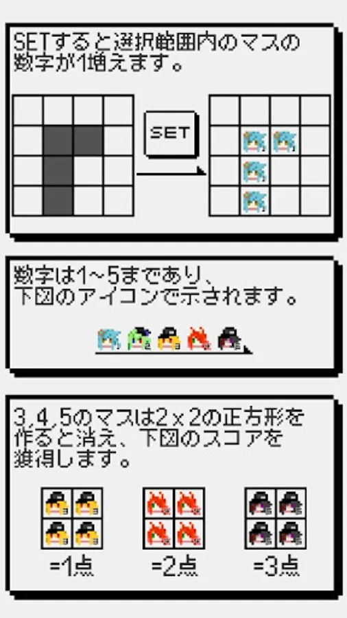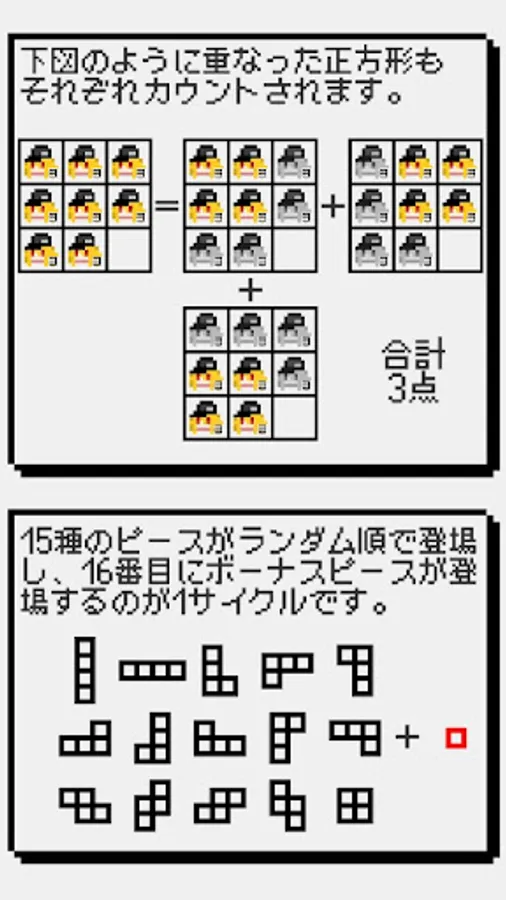 This is a puzzle game in which pieces (Tetromino) are placed in a 4x4 square to create and erase squares with the same numbers.