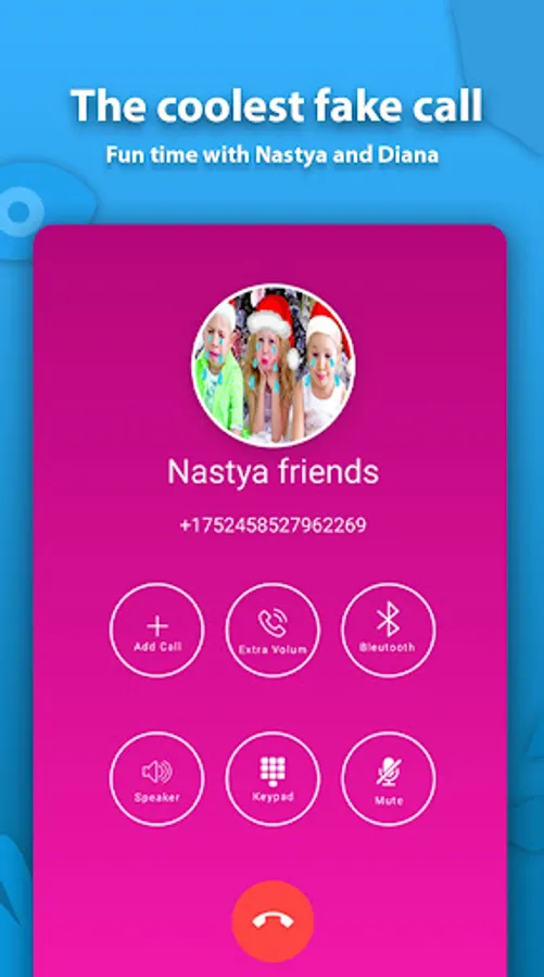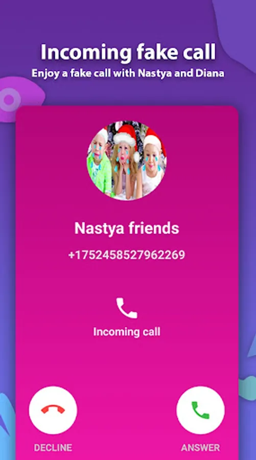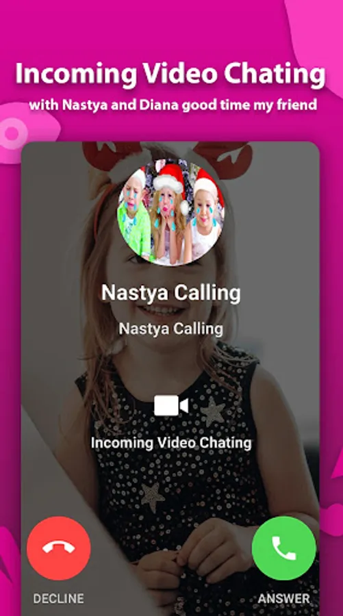 With like nastya and diana this app will allow you to receive a call from your favorite STAR This app is for fun, made by fans and for fans calling Nastya it a prank and is not an official app, just for entertainment and only for joke. is an application that helps you get a fake call right away from Diana and nastya