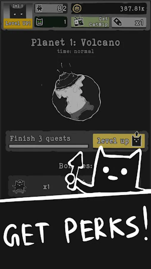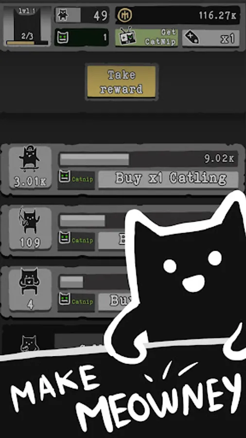 This is a 2D idle game, you don't have to click to earn Meowney - the cat currency, but you have to manage the resources, open new cats, which have incremental growth and earn you more cats idle.