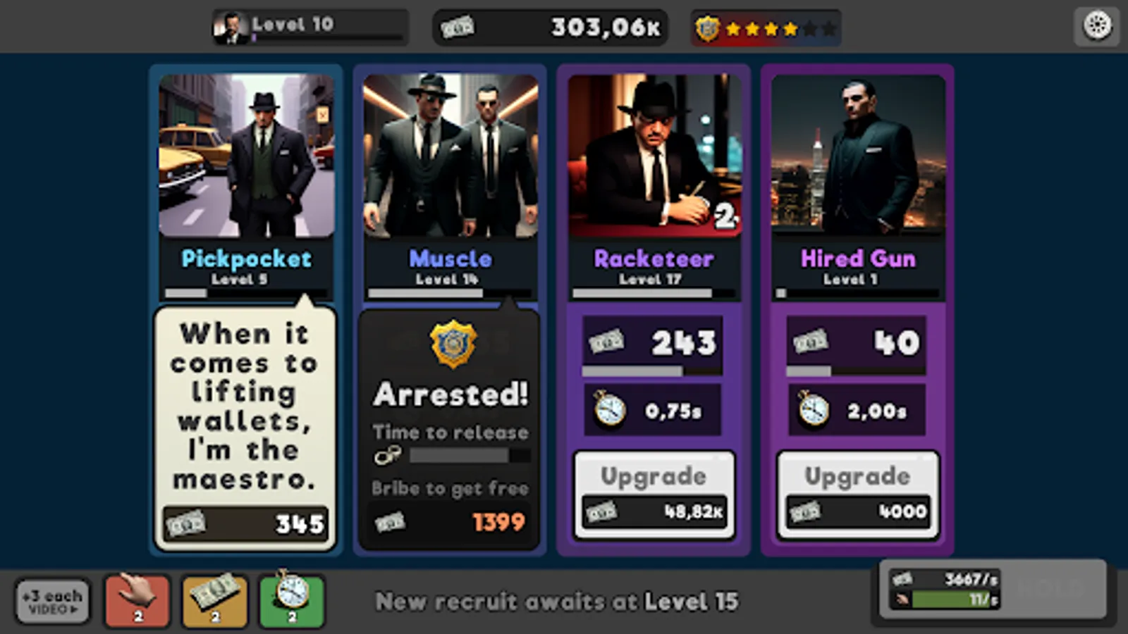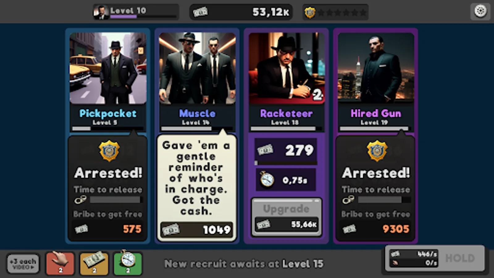 The key to power in Idle Mafia is strategy. Each gang member brings a unique skill to the table, helping to grow your operations, reduce heat from law enforcement, and outwit competitors. Your gang's loyalty is unbreakable, and their skills are unmatched. It's your job to deploy them wisely.