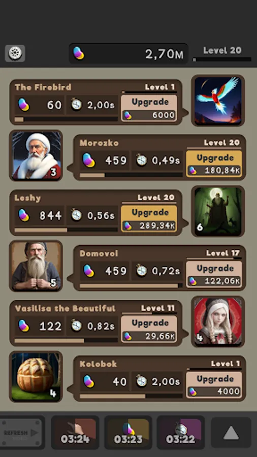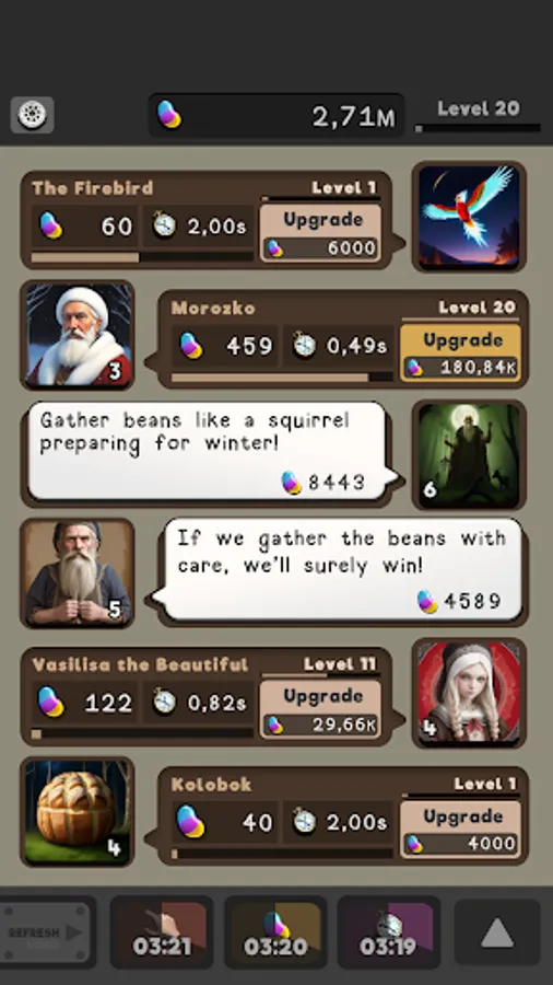 Regular updates will keep the game fresh and exciting, so there's always something new to look forward to. Dive into the magical world of Slavic folklore and join the bean-collecting adventure in Skazka Idle today!