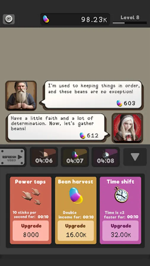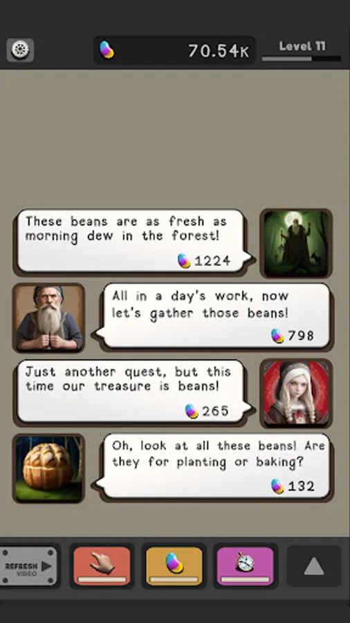 Skazka Idle also offers upgradeable perks for an added layer of gameplay. Every five levels, you'll discover a new character ready to join your bean-collecting team. With a mix of strategy and idle gaming, it's up to you to guide your team to the end.