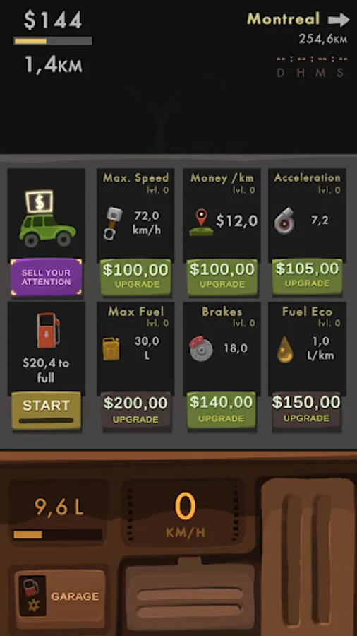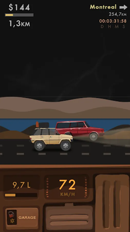 Earn cash for every kilometer, Upgrade your car for better stats and ride it to the end of the world.