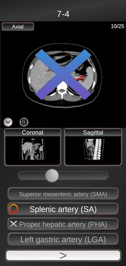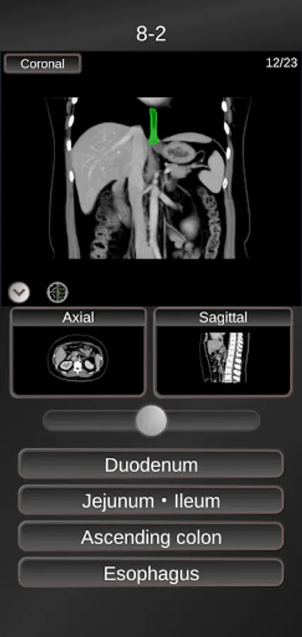 This app asks the anatomy name displayed on the CT image in a quiz format, and you can learn image anatomy efficiently by switching the axial section, coronal section, and sagittal section and selecting the answer from the 4-choice question. I will.