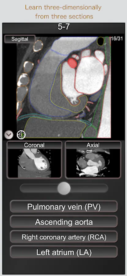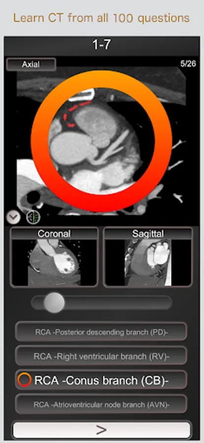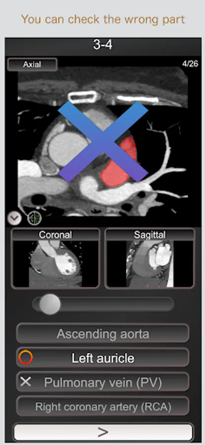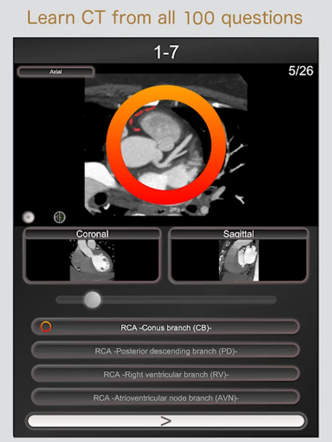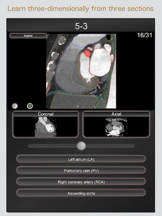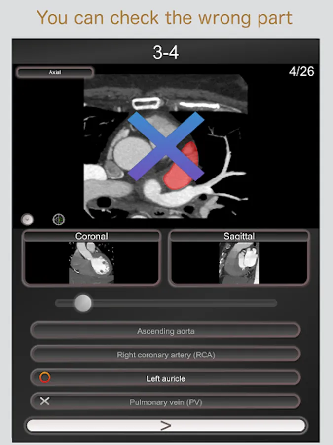 This app asks the anatomy name displayed on the CT image in a quiz format, and you can learn image anatomy efficiently by switching the axial section, coronal section, and sagittal section and selecting the answer from the 4-choice question. increase.