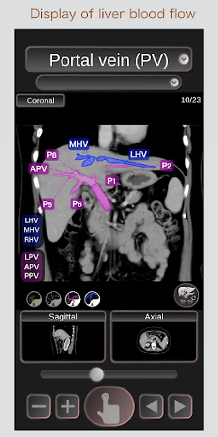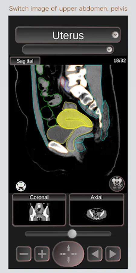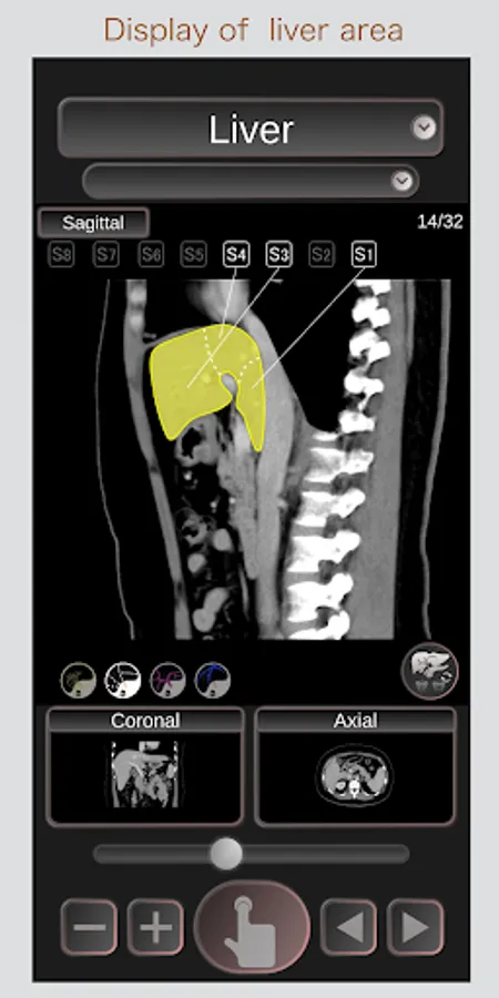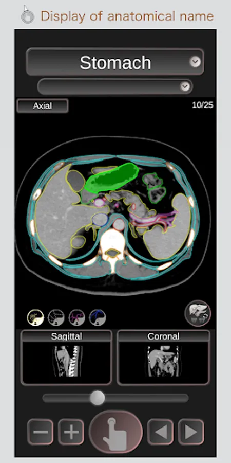 In this app, you can display the anatomical name just by touching the image, and not only can check the target area immediately, but also switch display of axial cross-section, coronal cross-section and sagittal cross-section is possible. You can instantly grasp the positional relationship.