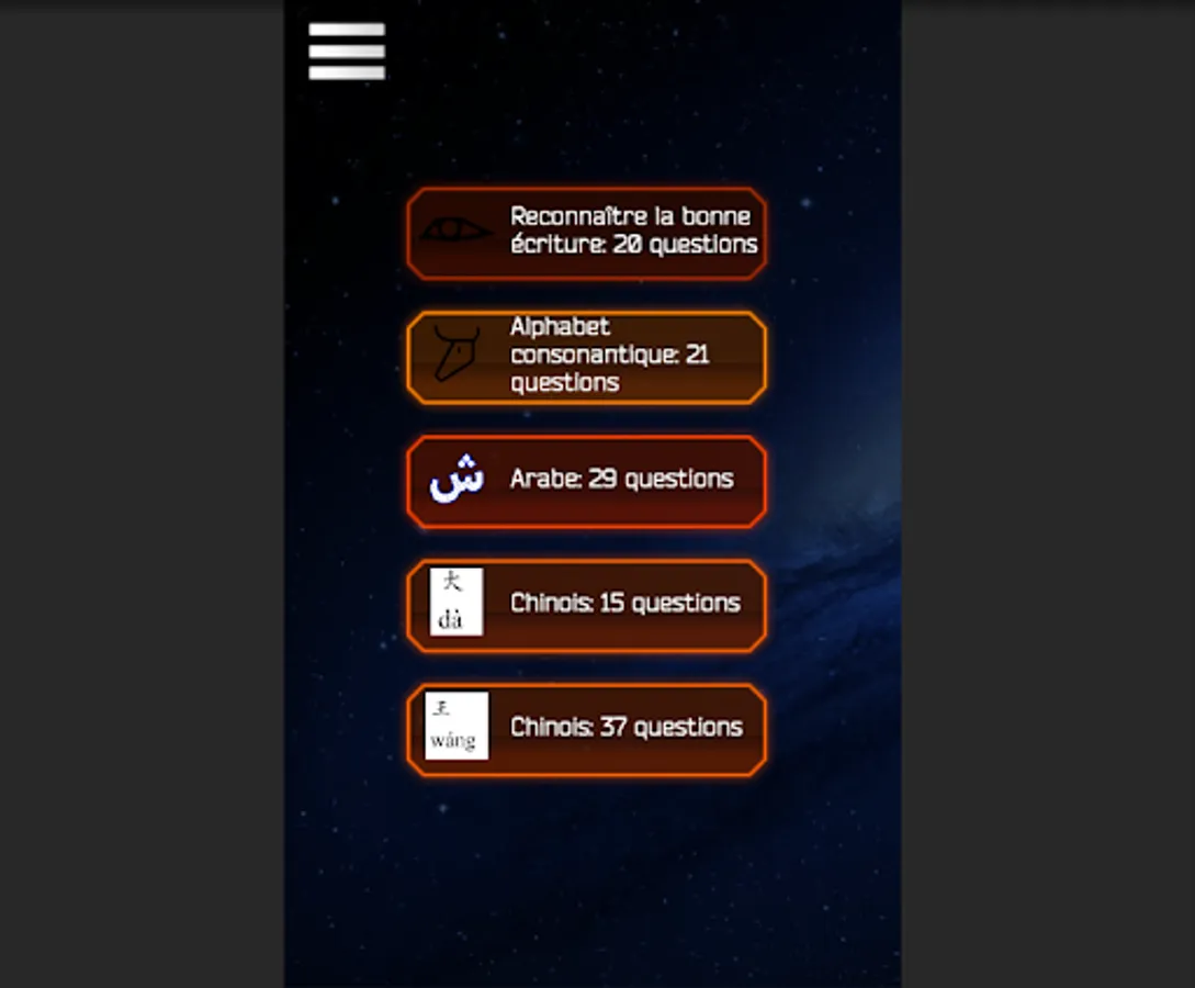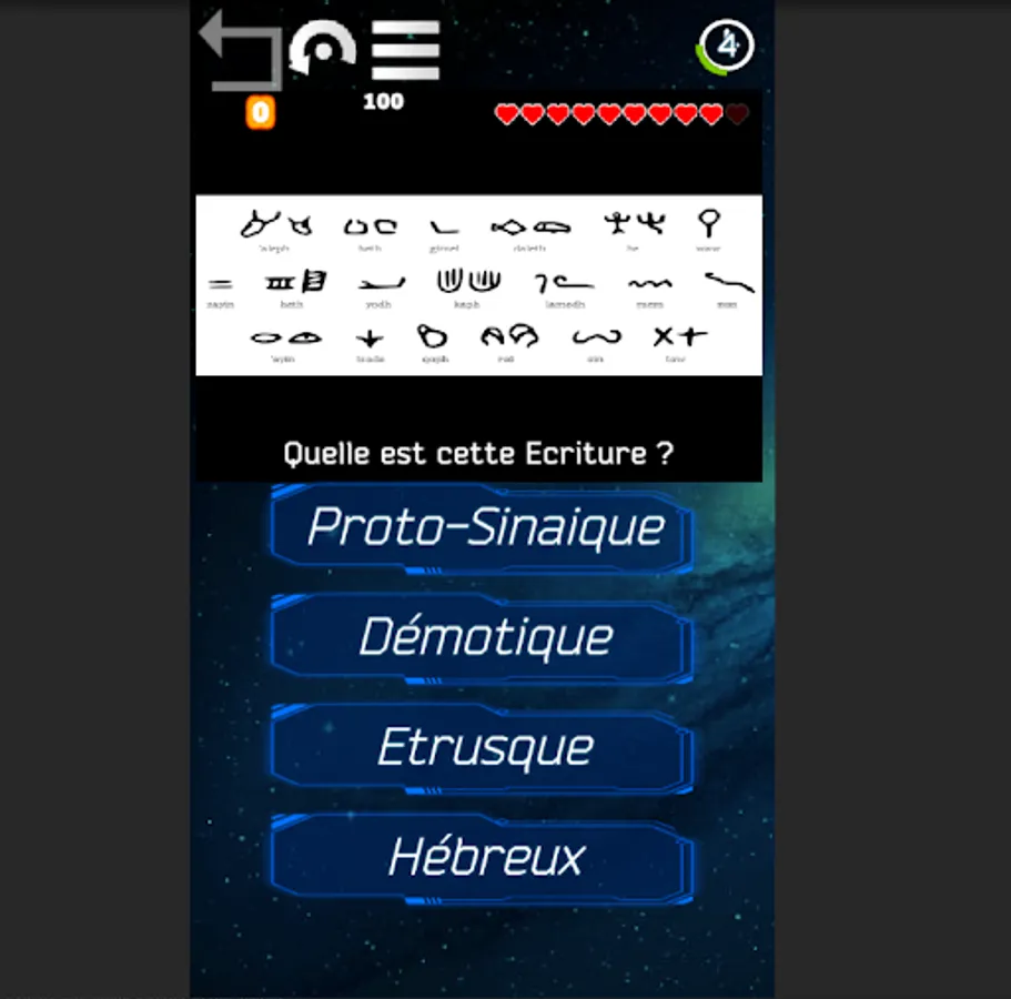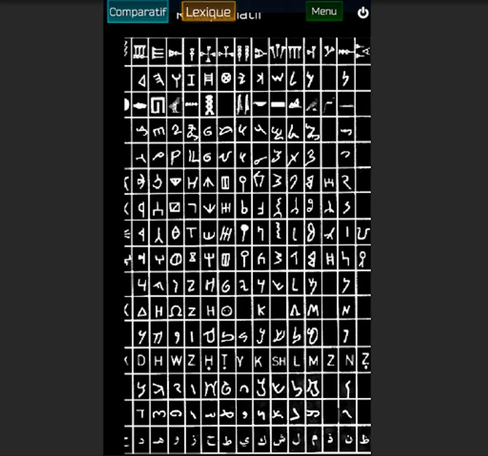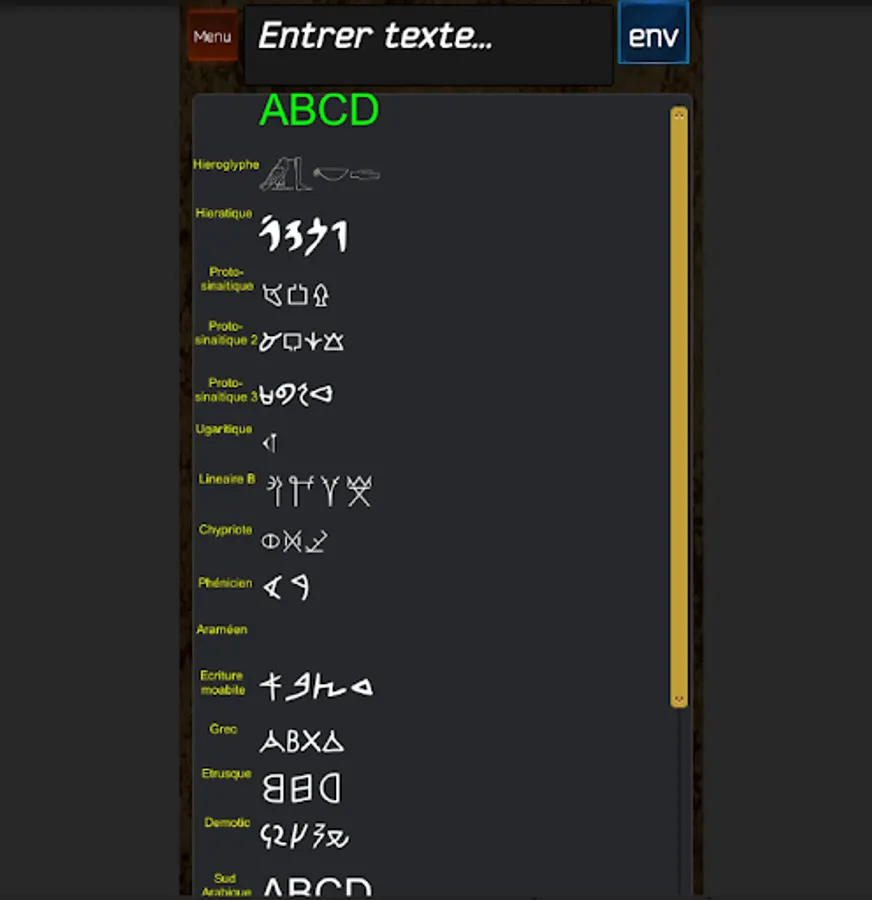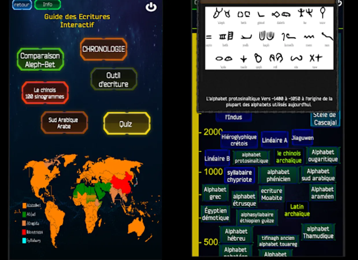 Offline application to Recognize scriptures, do a quiz (questions and answers) write in Phoenician in Syriac or Cuneiform and more than 30 scriptures thanks to this small free application you can learn more than 50 Chinese sinograms and also learn Arabic script , Hebrew or Aramaic. more than 10 submenu, description: Menu Evolution of writing with time scale, Menu comparison of different writing, Menu Learn Chinese And learn Arabic characters, quiz 1: recognize the right scripts 2 the alphabet consonantal, 3 the Arabic alphabet, 3 the Chinese characters 4 the Chinese 50 questions ... tools from Latin to Hieroglyphics, Proto Sinaitic, Ugaritic, Linear A and B, Cypriot, Phoenician, Aramaic, Moabite, Greek, Etruscan, Demotic, Sabaean , Nabataean, Samaritan, Brahmi, Arabic, Devanagari, Cyrillic, Gokturk and others.
