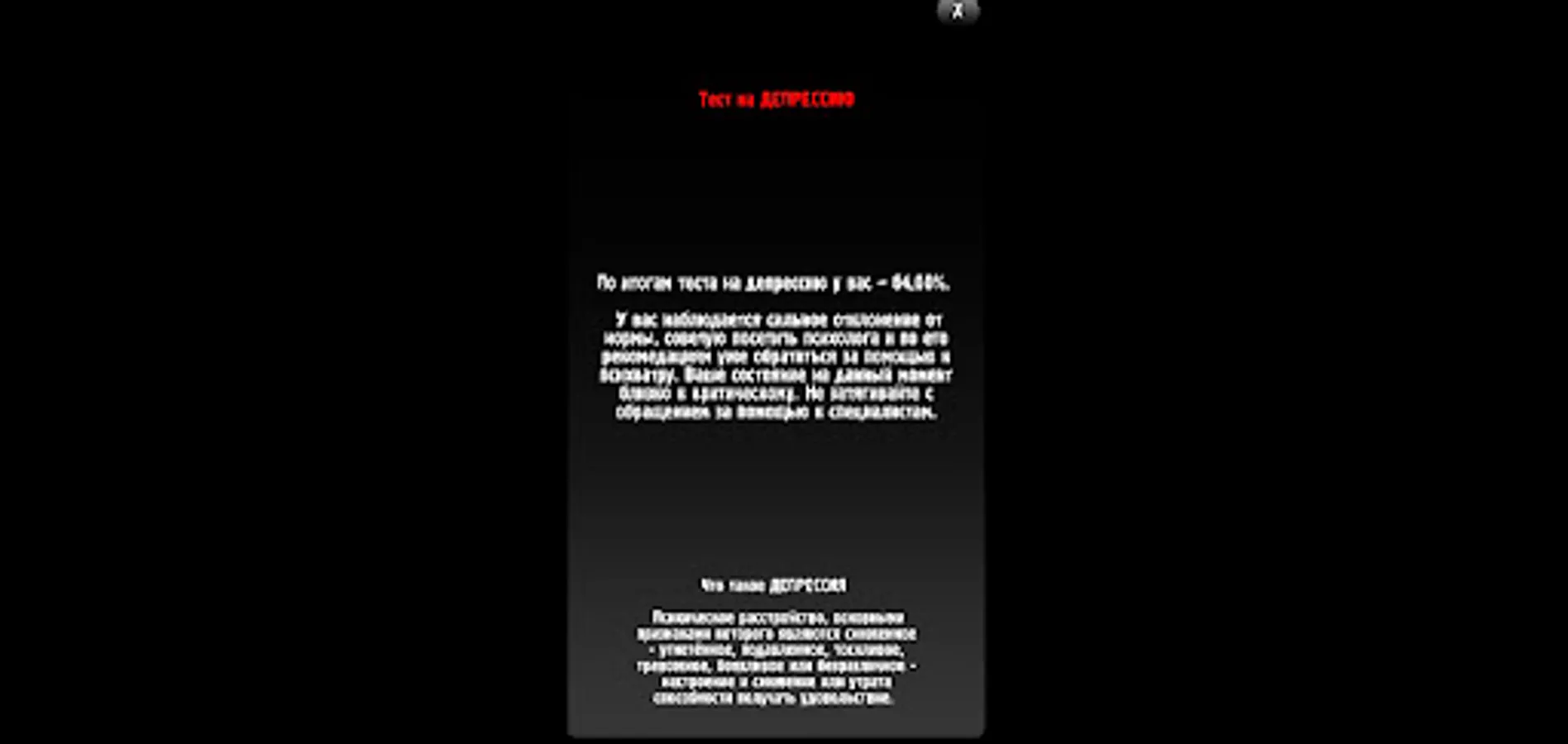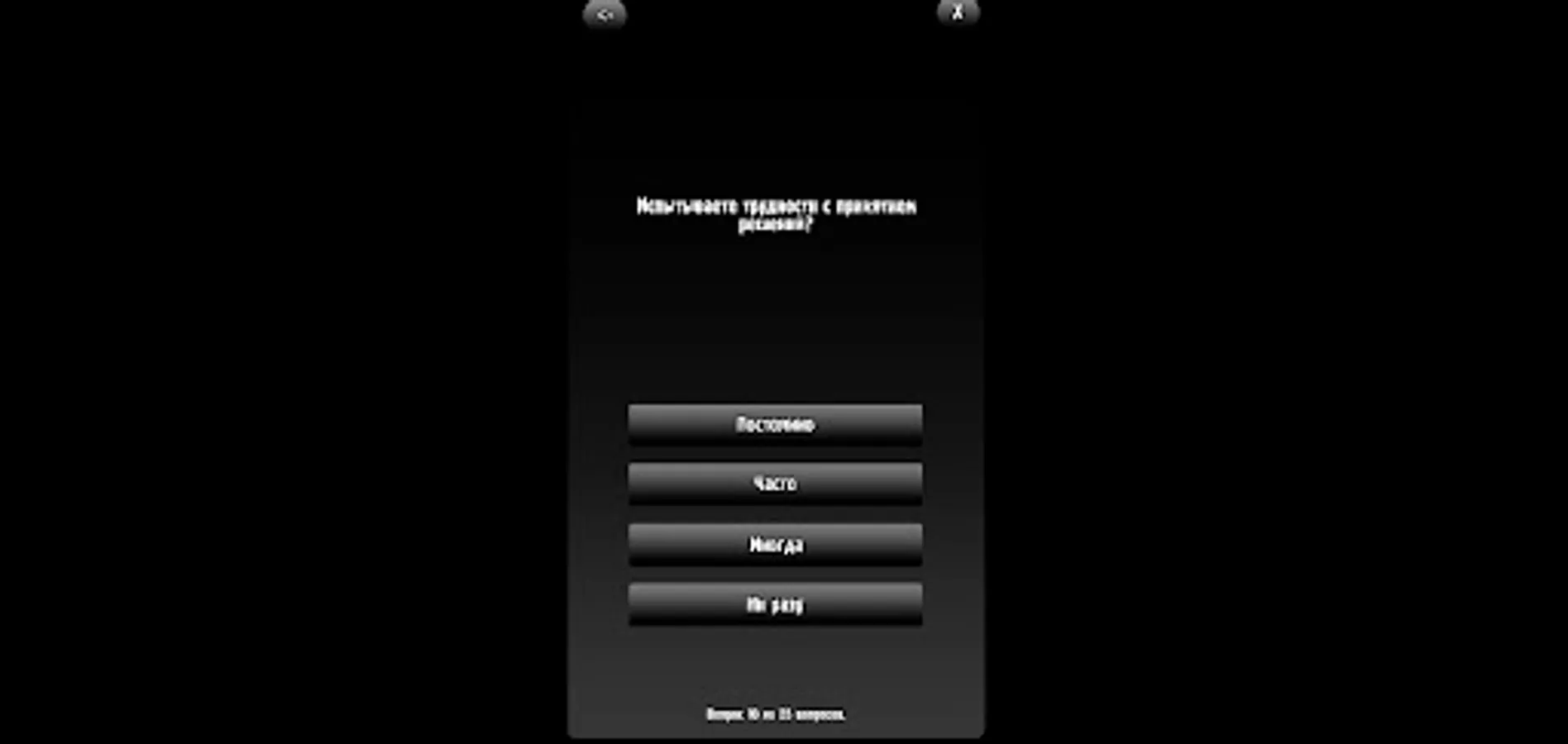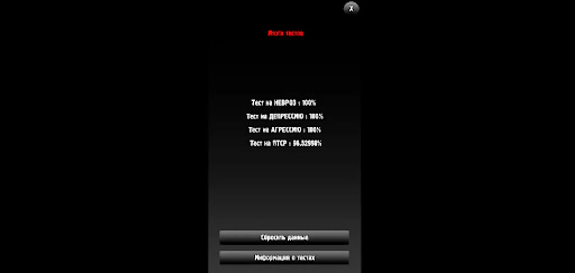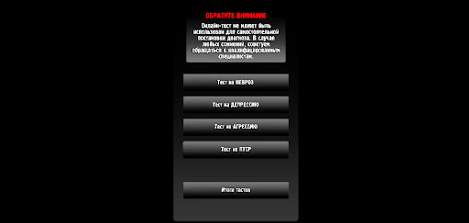 By downloading our application, you can take clinical tests for neurotic disorder, depression, aggressiveness and PTSD. It is important to understand that this is just a preliminary assessment of your condition, the results obtained must be interpreted by a specialist (the diagnosis is made only by a full-time psychiatrist). Also, these tests can be used to track the dynamics of the psychotherapeutic process.