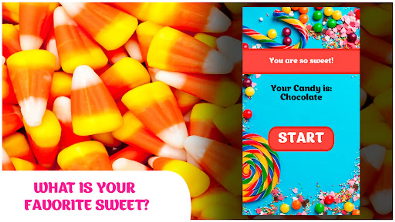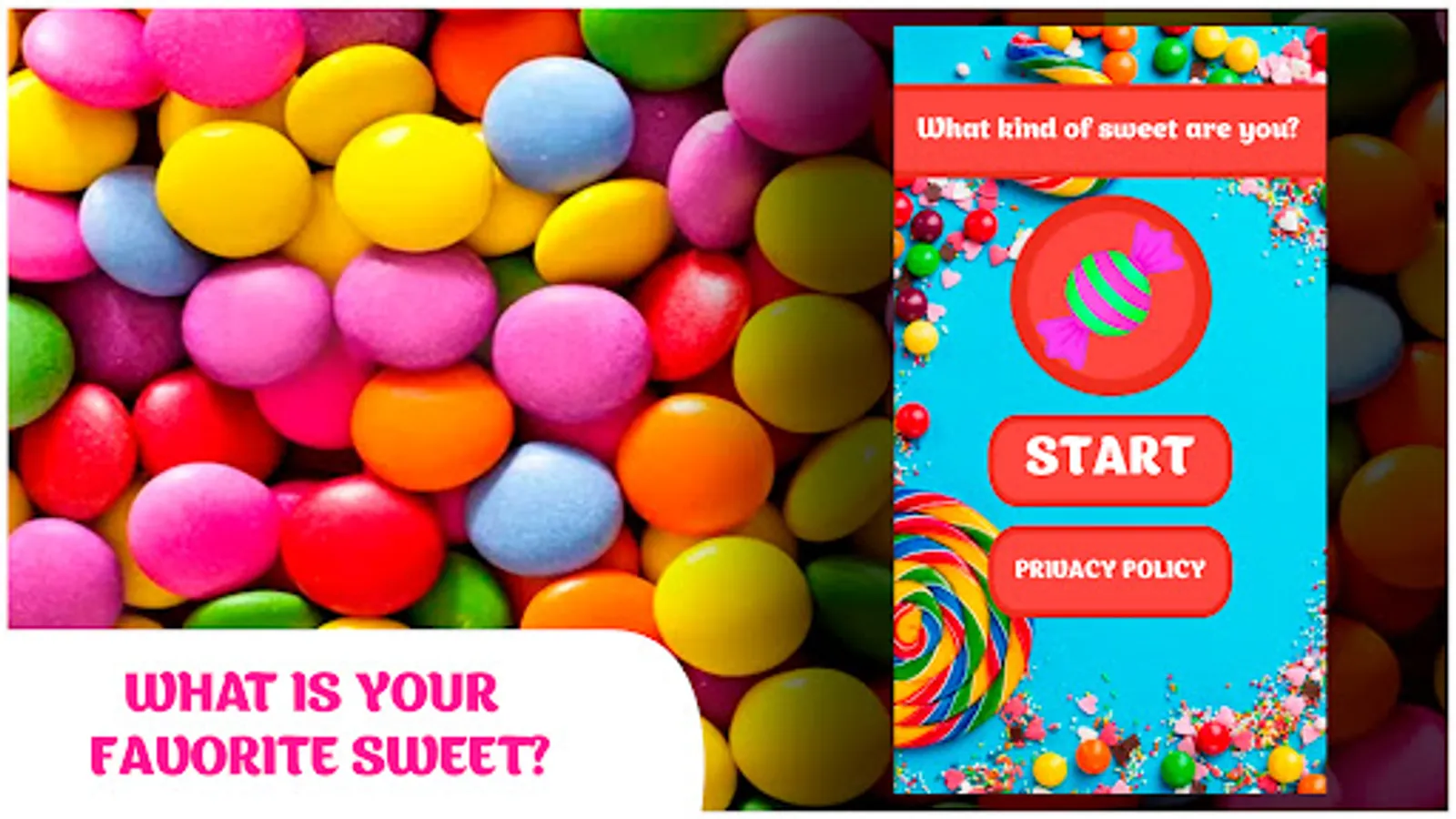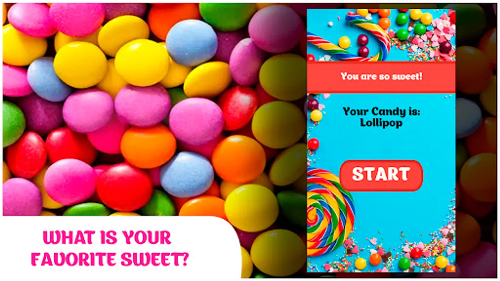 Find out right now which candy you like best and will suit you. Who you are? Lollipop or chocolate cake? Find out right now in our application and share the result with your friends. Look carefully and watch what you eat, but everyone will confirm that sweet is the most delicious!