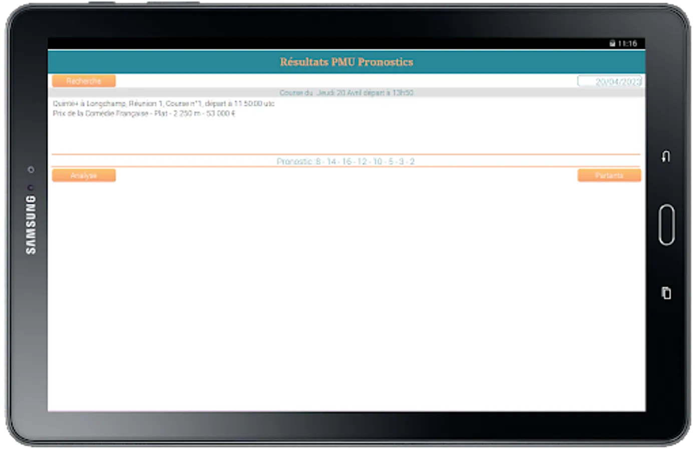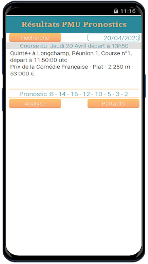 The application gives you the Quinté+ program of the day, the analysis, the list of runners, the forecast and finally the history of the race results.