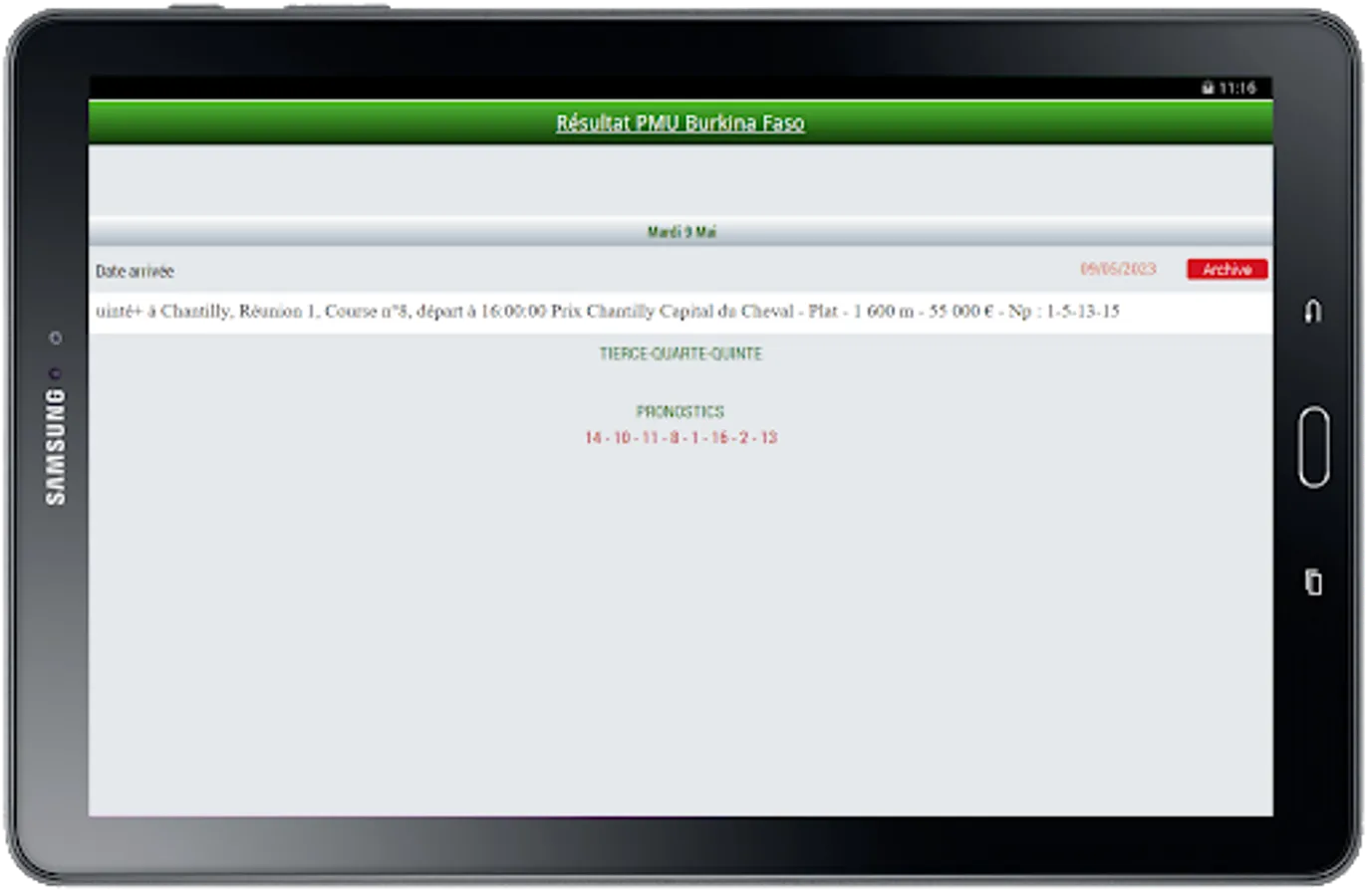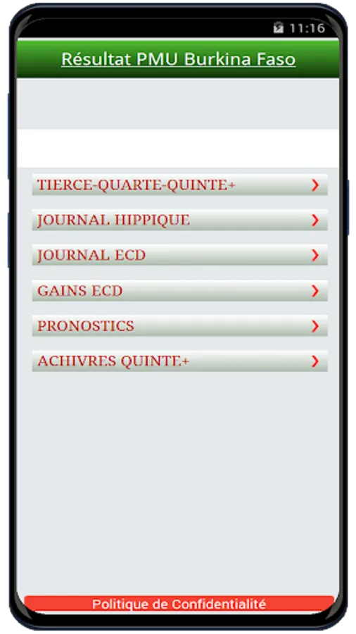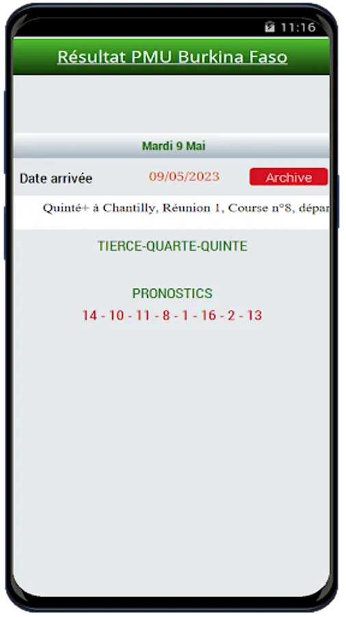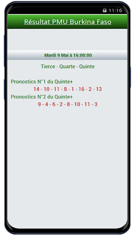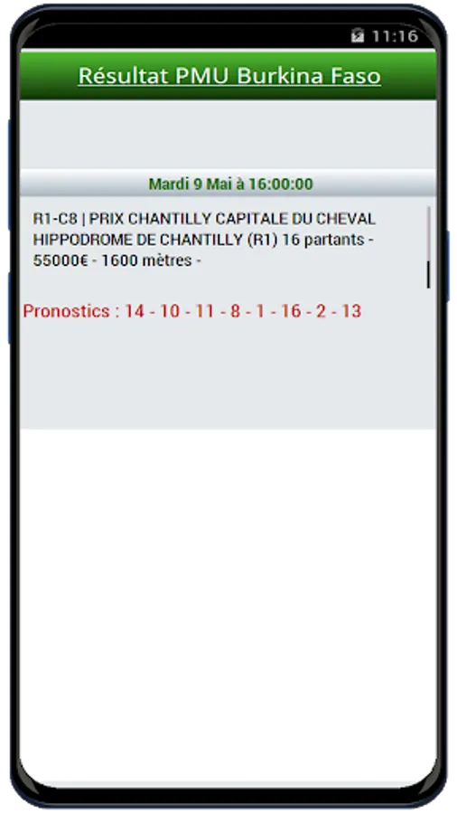 The application gives you the results of the horse courses, the earnings, the horse logs, the history of the results of the PMUB of Burkina Faso.