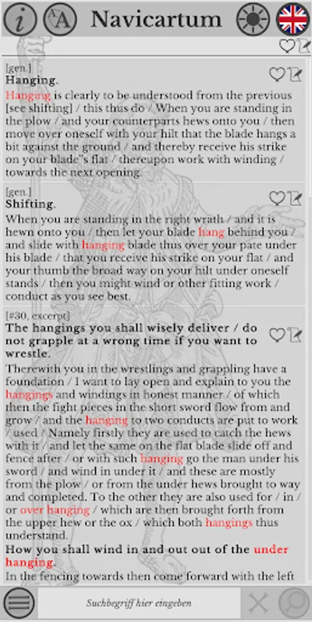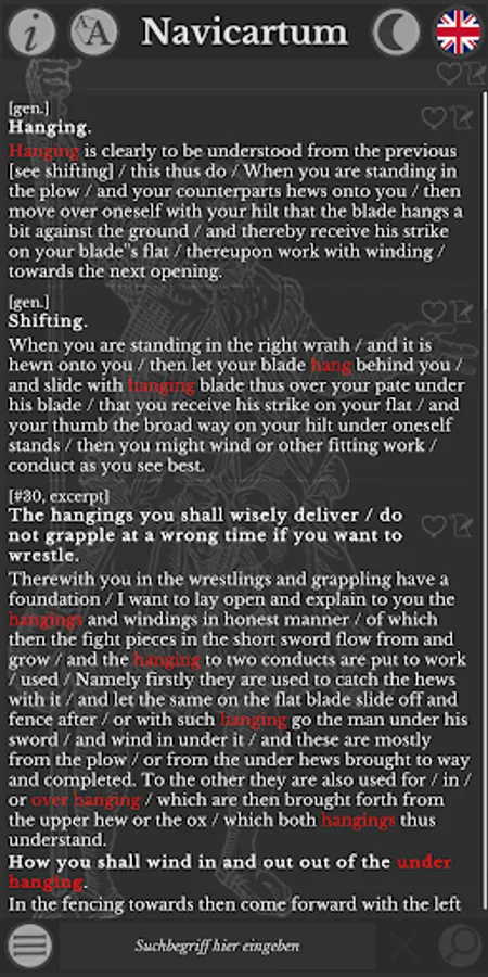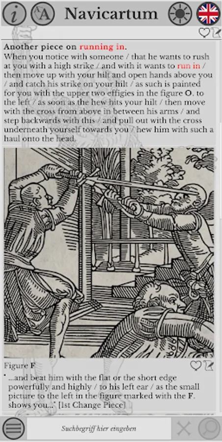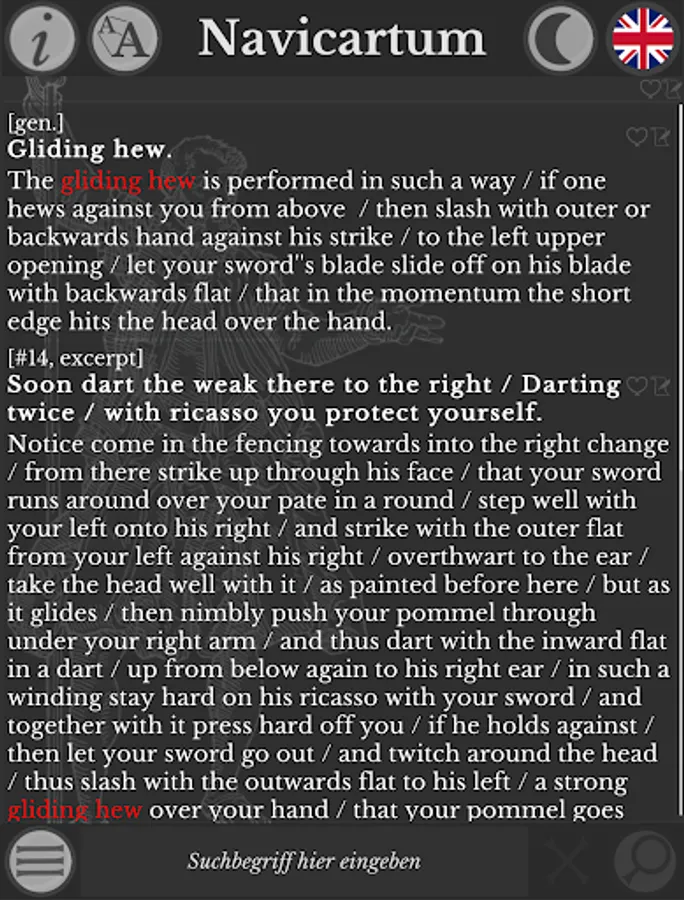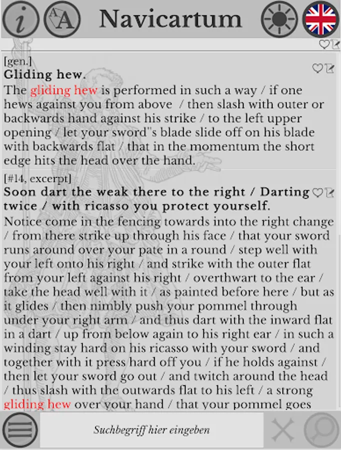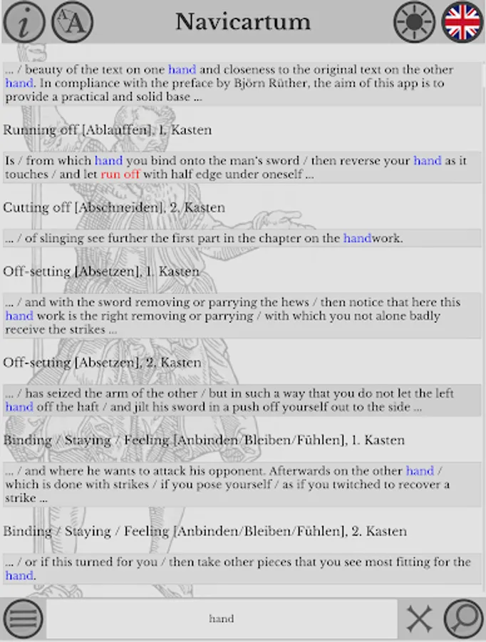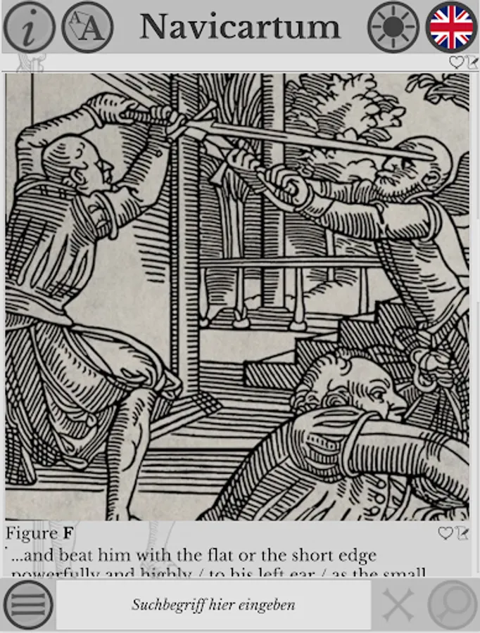 Navicartum features not only a transcription and translation of the sword part of the fencing treatise including all images, but also a newly composed version of the book as a reference book. It contains among other things conceptual interpretations of all techniques and an improved referencing and description of all images. And all of this in combination with the merits of features of the modern times, like f.e. bookmarks, notes and a full text search feature.