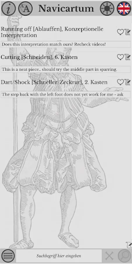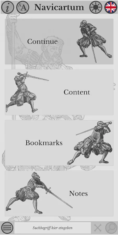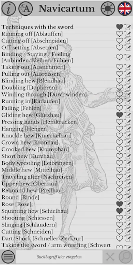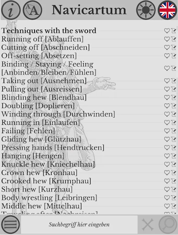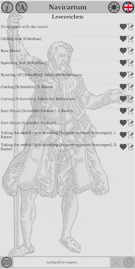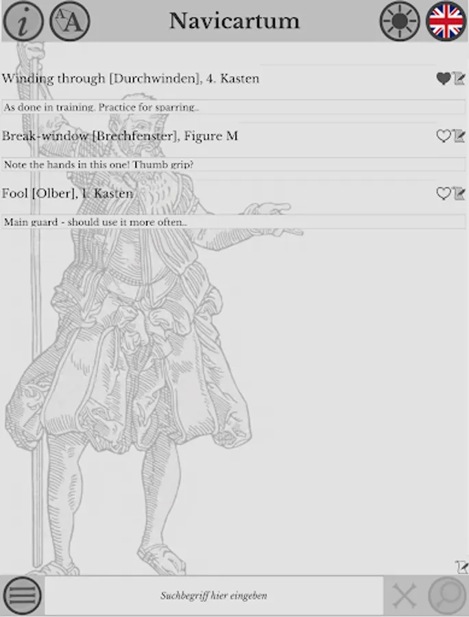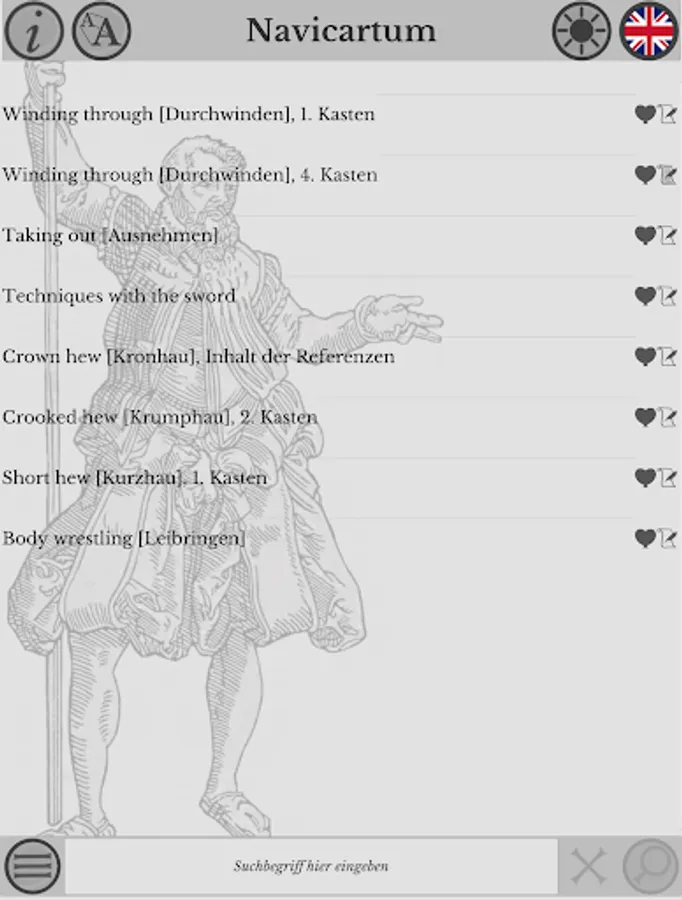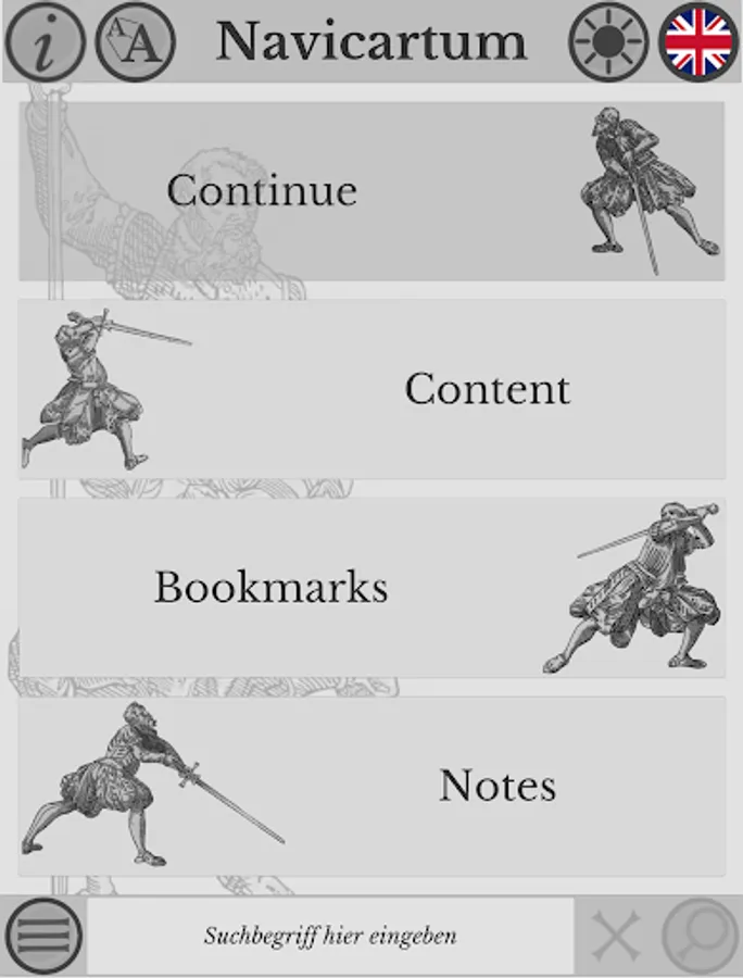 Navicartum features not only a transcription and translation of the sword part of the fencing treatise including all images, but also a newly composed version of the book as a reference book. It contains among other things conceptual interpretations of all techniques and an improved referencing and description of all images. And all of this in combination with the merits of features of the modern times, like f.e. bookmarks, notes and a full text search feature.