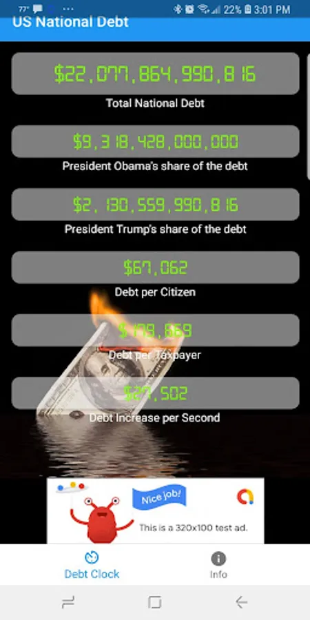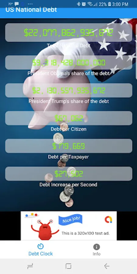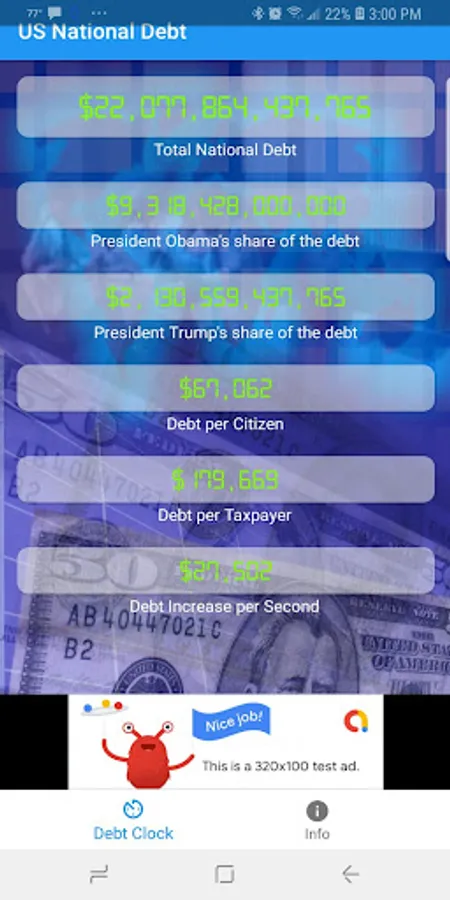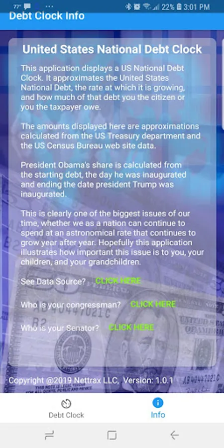 Application displays US National debt clock and estimates the growth of the US debt. Clock shows both president Obama's and president Trump's share of the debt. This is neither a republican or democrat issue, it is truly bipartisan.