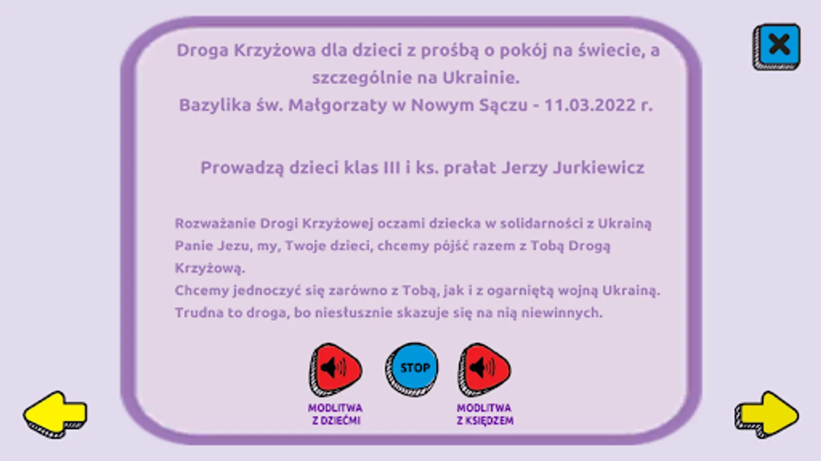 The Children's Prayer Highway (MAD) was started with the Way of the Cross for children with a request for peace in the world, especially in Ukraine, in the Basilica of St. Małgorzata in Nowy Sącz on March 11, 2022. The originator of this prayer was the PROMYCZEK Publishing House, and it was broadcast on its air by the RDN radio. The Catholic Primary Schools from Nowy Sącz, the Jesuit Education Center, Primary School No. 20 im. Stefan Card. Wyszyński and Primary School No. 21 for them. Jana Pawła II and the Youth Palace in Nowy Sącz.