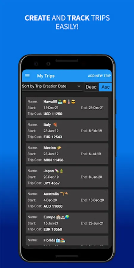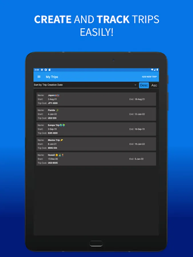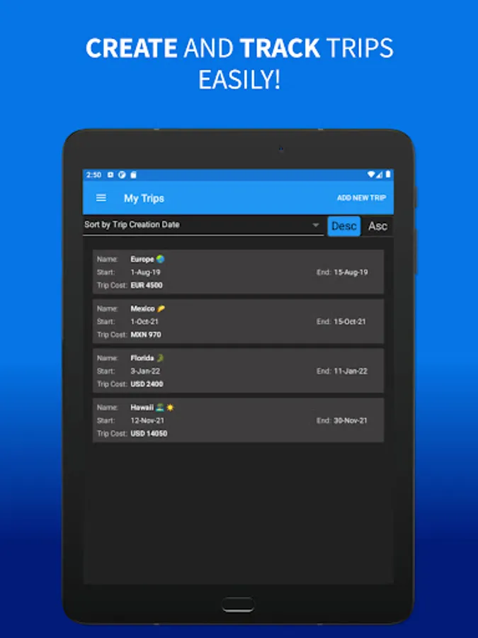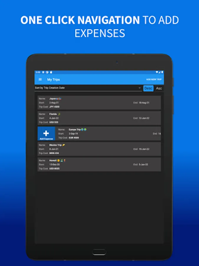 SaveMyTrip makes it quick and easy to create a new trip and let's you track all your trips and expenses in one place and in real time. Shows you a snapshot of all your trips. You can also sort your trips and expenses based on various criteria to quickly access a trip.