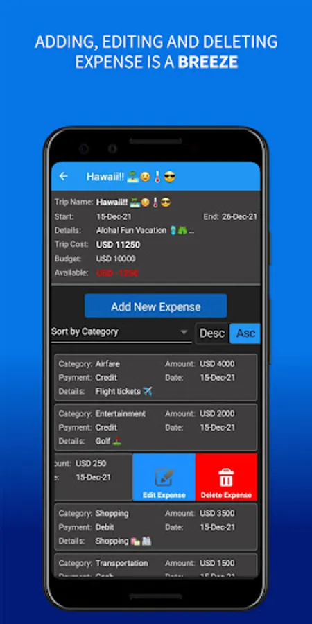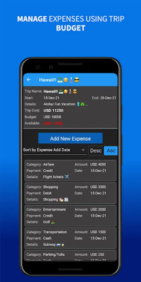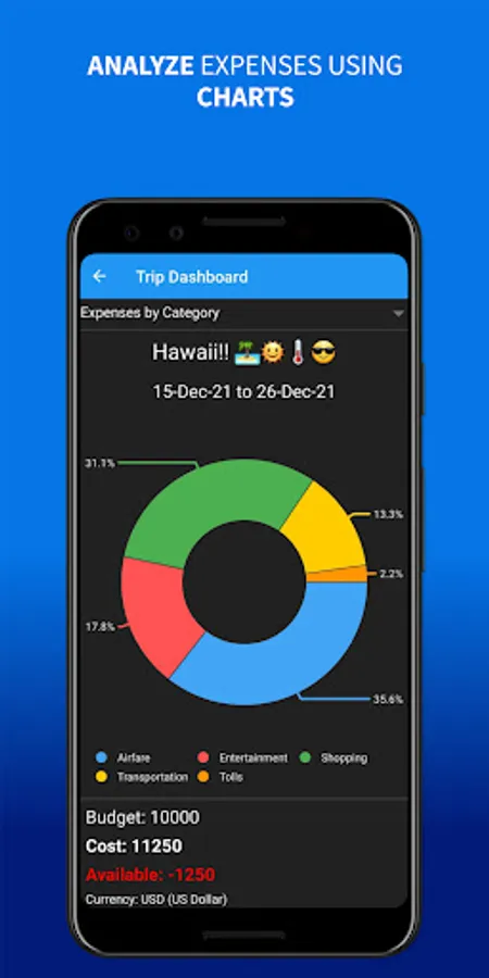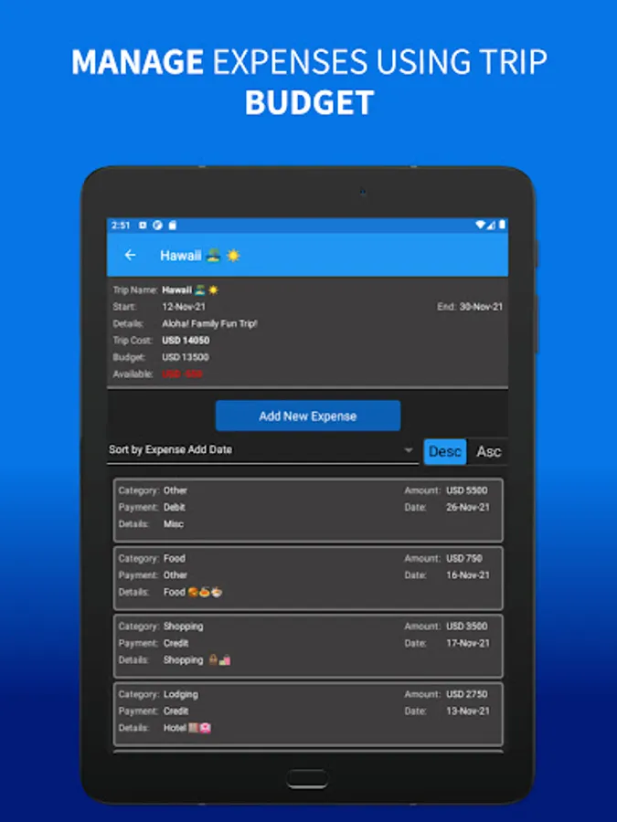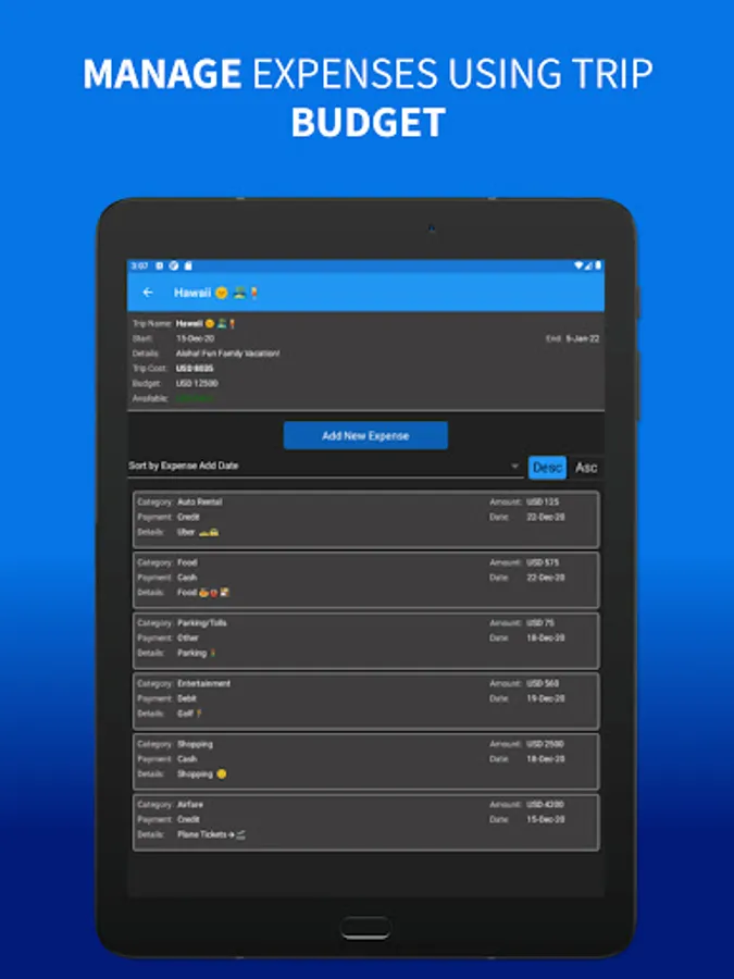 Add or update expenses on the go or anytime. Manage all your expenses in one place. Your trip and expenses information is updated instantly as soon as you add a new expense or update an existing expense. You can add emojis in your expense details for fun or to convey useful information about the expense.
