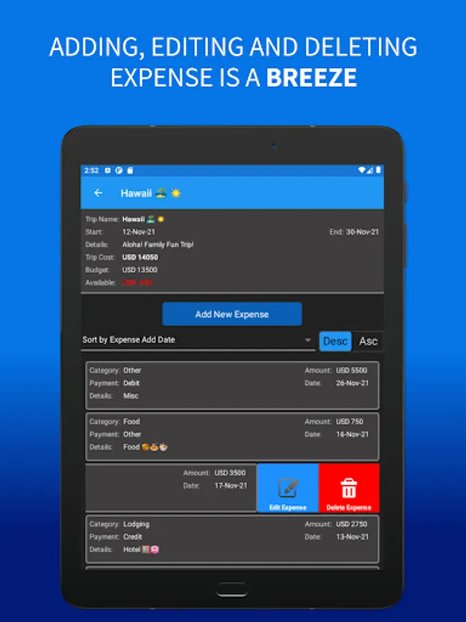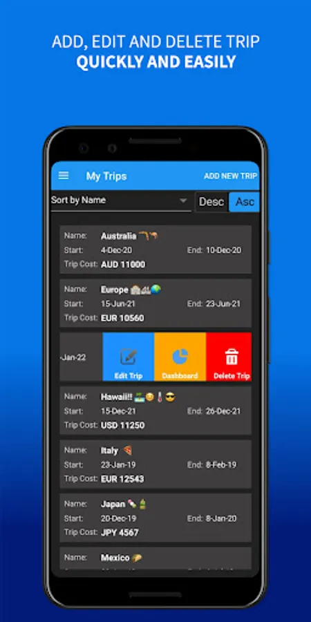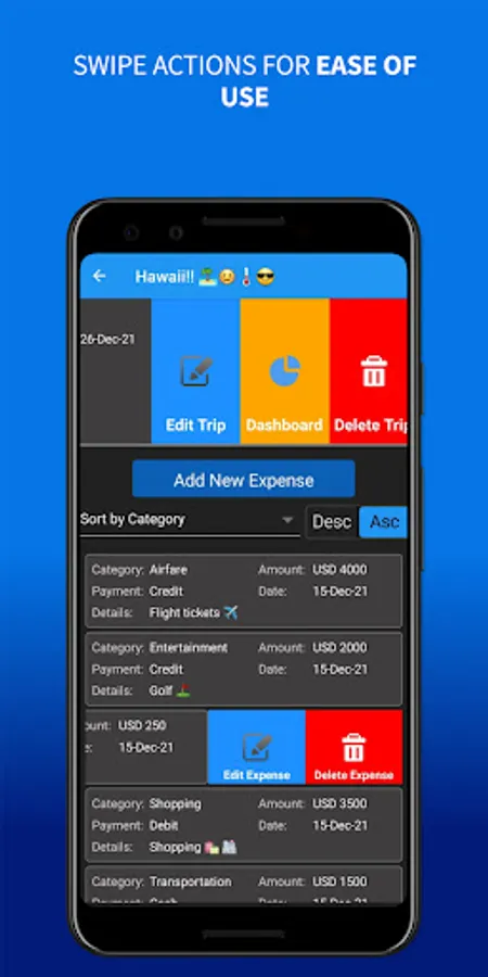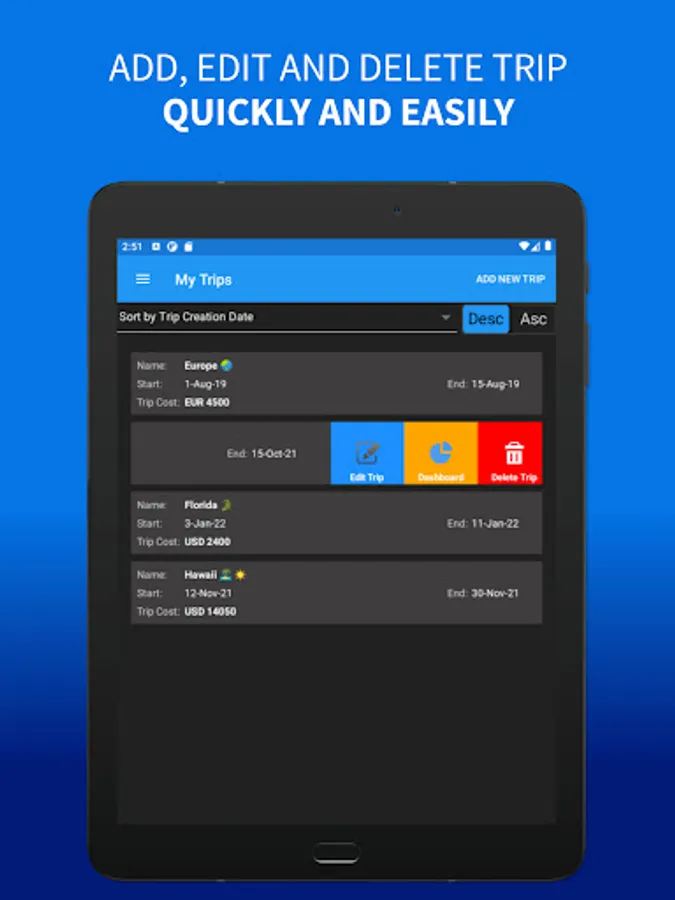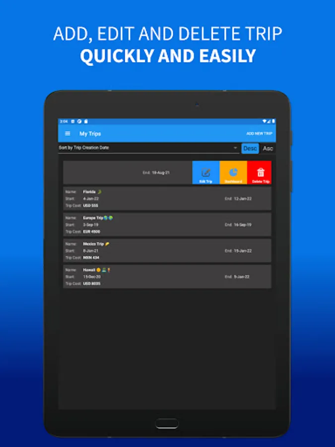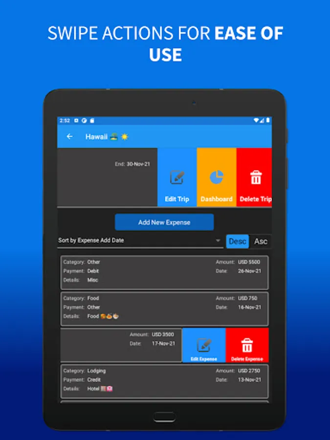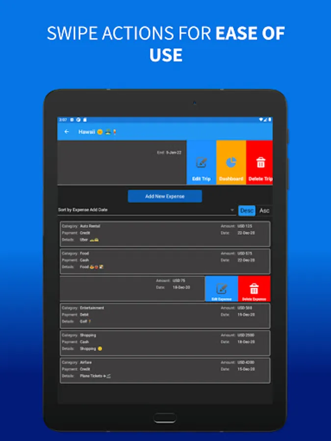 Many functions of the app are at your fingertips, literally. You can quickly and easily access many functions with the swipe of your finger. You can edit or delete a trip, add/edit/delete/analyze expenses, and access dashboard with one swipe of your finger. You can also sort your trips, expenses, and available backups using various search criteria for quick access to the information you are looking for.