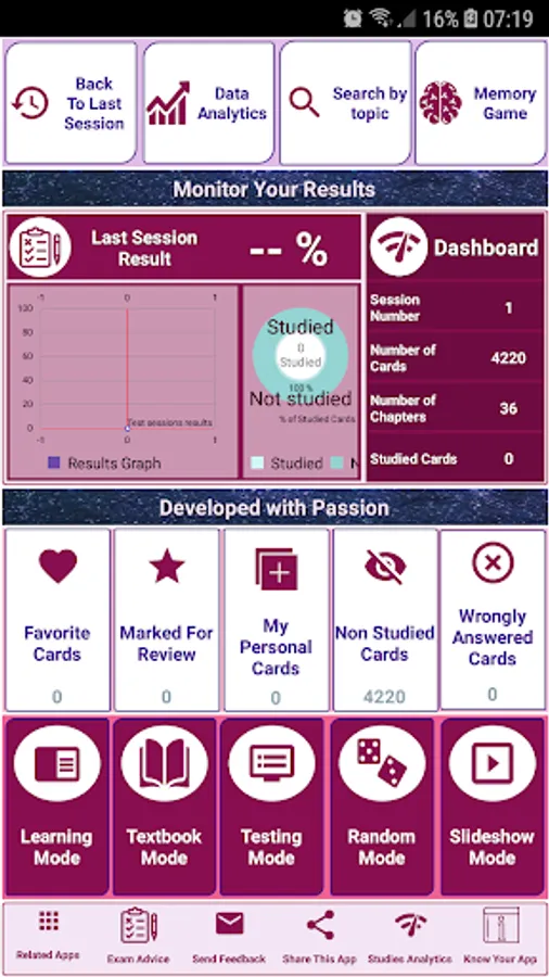 - Get the most advanced data analytics features that analyses your study session by study mode, scores, time spent…etc.